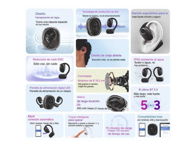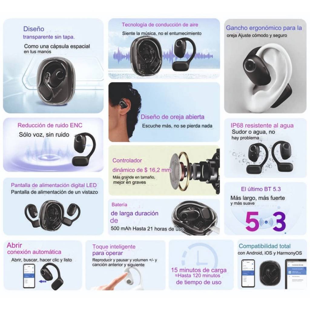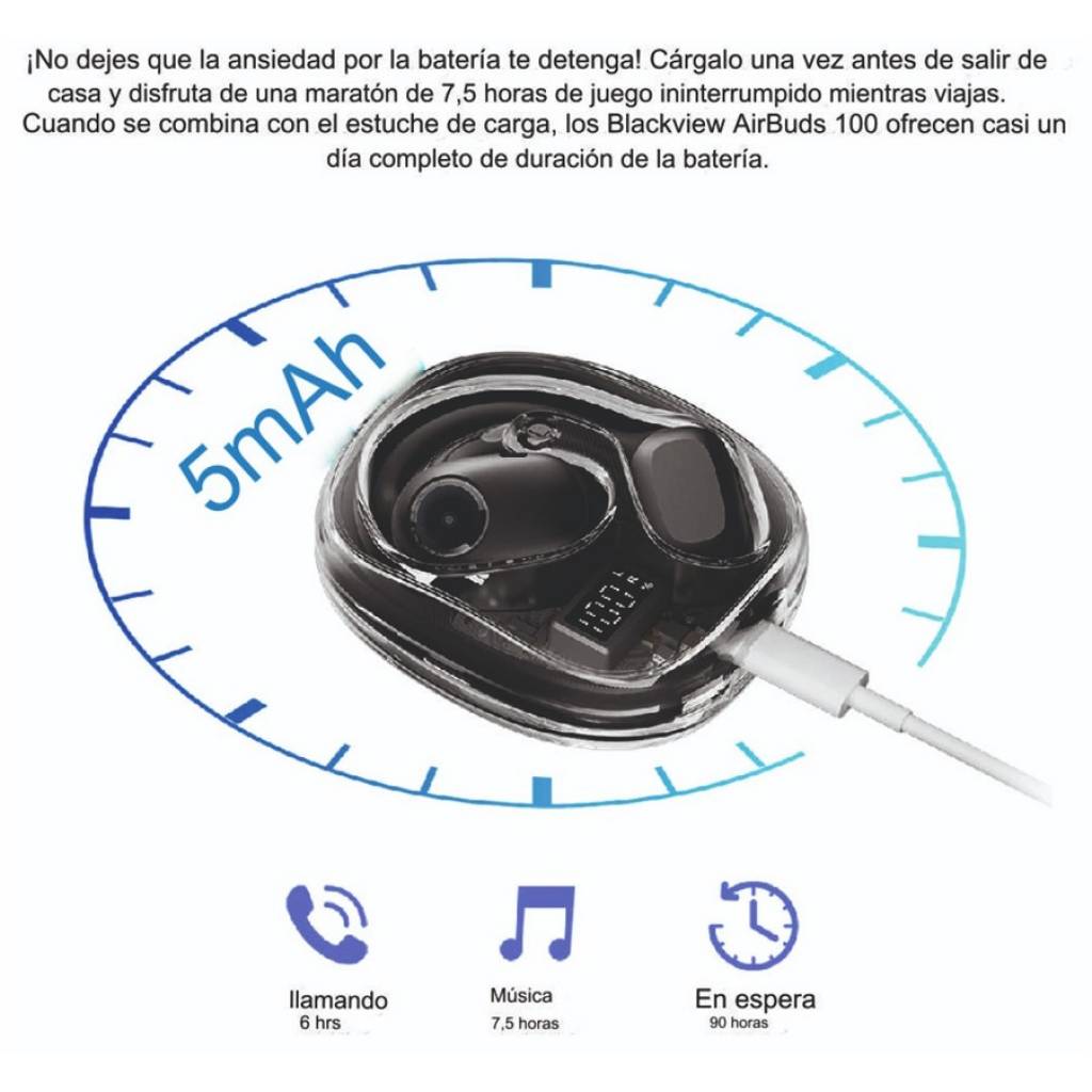 Los Blackview AirBuds 100 combinan diseño innovador, gran autonomía y sonido potente en un formato moderno tipo cápsula transparente. Gracias a su tecnología de conducción aérea y Bluetooth 5.3, ofrecen una experiencia cómoda, estable y de alta calidad para el uso diario, deporte o entretenimiento.