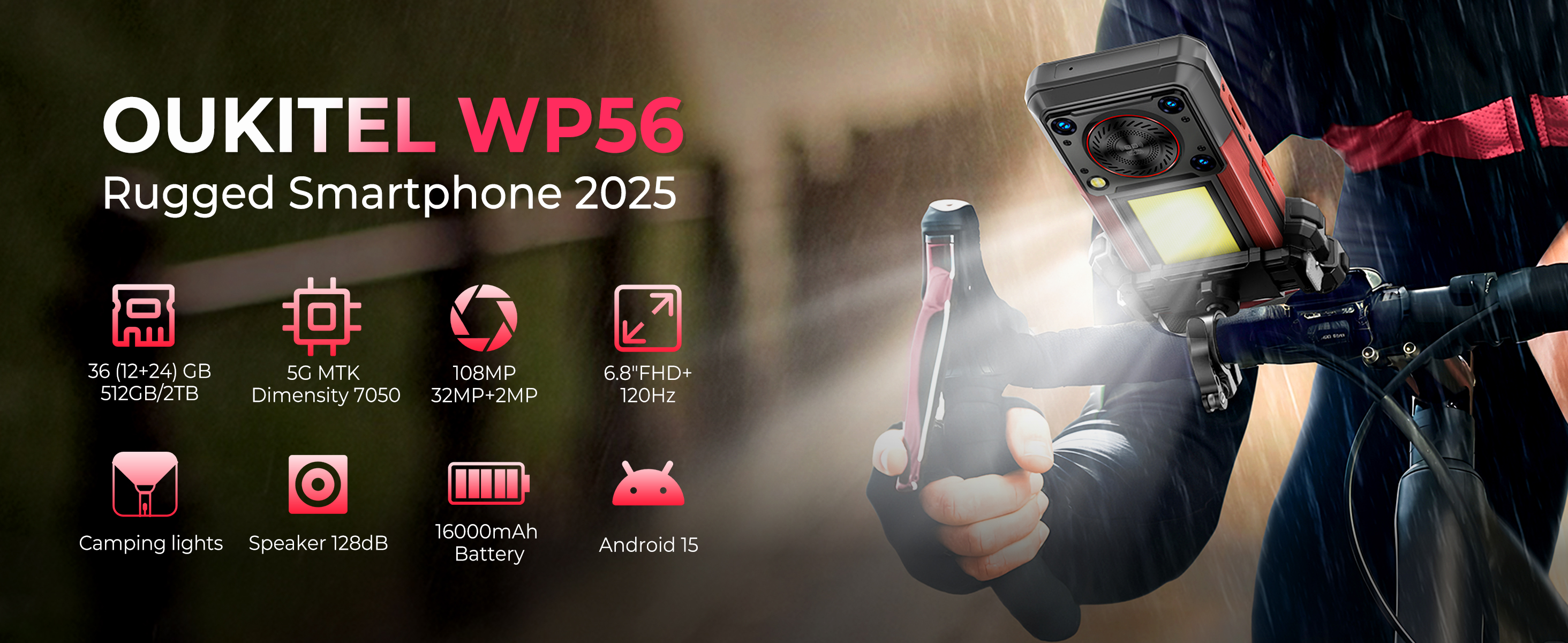 El Oukitel WP56 5G es un smartphone rugerizado de alto rendimiento diseñado para soportar condiciones extremas sin sacrificar potencia ni autonomía. Equipado con el procesador Dimensity 7050, una pantalla FHD de 6.8" con 550 nits y una gigantesca batería de 16000 mAh, ofrece un rendimiento fluido y uso prolongado incluso en jornadas intensas. Sus 12 GB de RAM ampliables a 36 GB permiten ejecutar múltiples apps y juegos sin interrupciones, mientras que sus cámaras de 32 MP y 108 MP brindan excelente calidad fotográfica. Su resistencia IP68, IP69K y certificación MIL-STD-810H lo convierten en un equipo ideal para trabajo, aventura y uso exigente. Incluye 5G, NFC, desbloqueo por huella, luz camping y parlante de 3 W.