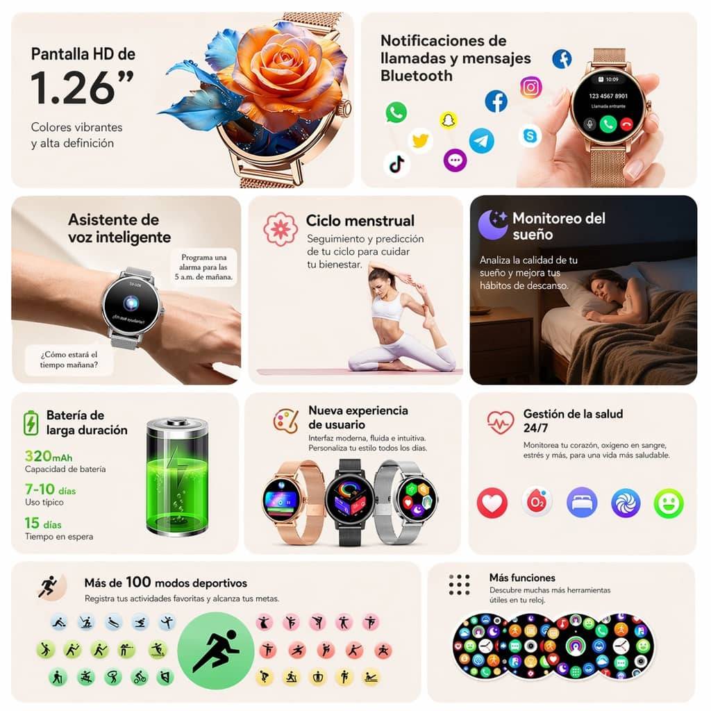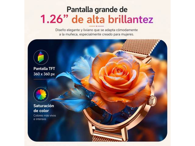 - Pantalla táctil HD de 1.26" con resolución 360 x 360