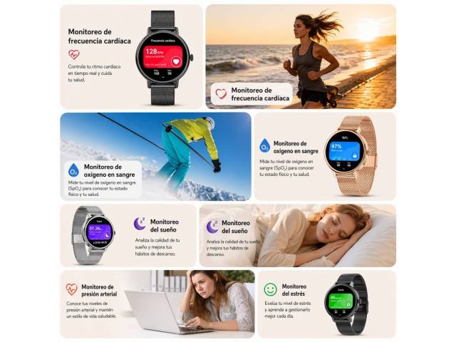 - Monitoreo de salud: frecuencia cardíaca, oxígeno en sangre y sueño