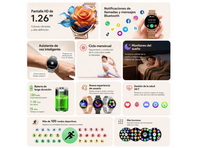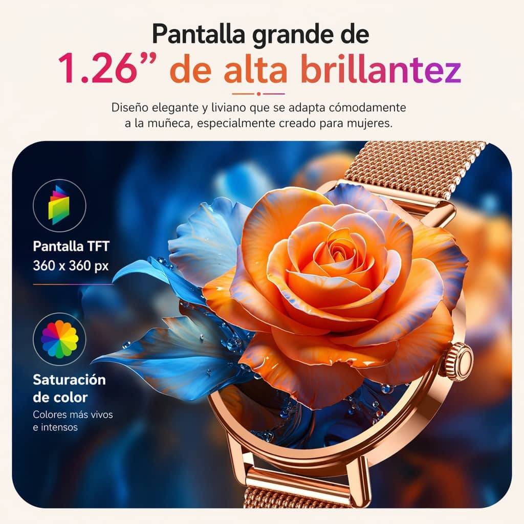- Pantalla táctil HD de 1.26" con resolución 360 x 360