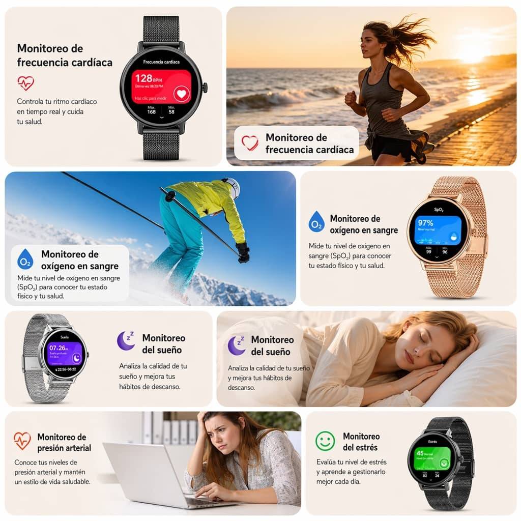 - Monitoreo de salud: frecuencia cardíaca, oxígeno en sangre y sueño
