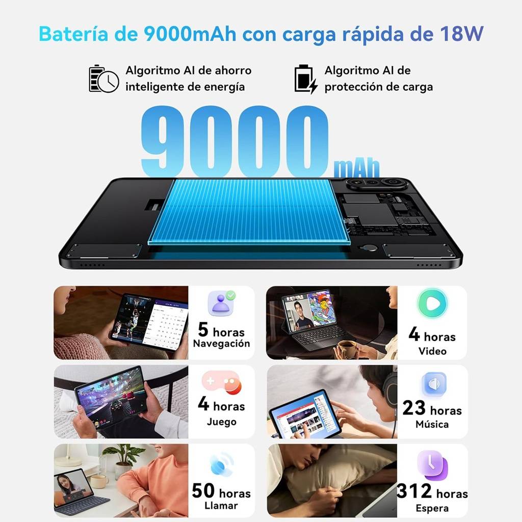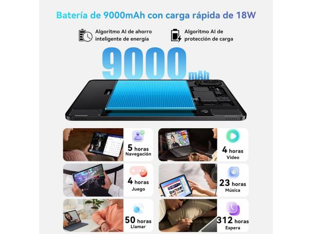 La tableta Android con batería de alta capacidad de 9000 mAh ofrece una resistencia excepcional, diseñada para usuarios que se niegan a comprometerse. Soporta 12 horas de reproducción de video, 8 horas de juego, 15 horas de uso mixto y 912 horas de espera.