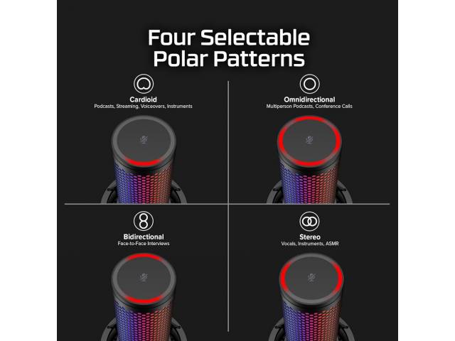 - Cuatro patrones polares seleccionables: QuadCast 2 S ofrece cuatro patrones polares (cardioide, omnidireccional, bidireccional o estéreo) para adaptarse a una amplia variedad de necesidades de grabación.