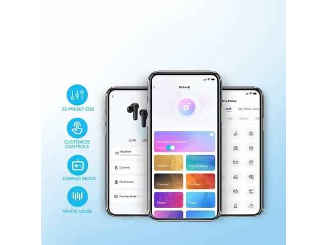 Personaliza tu experiencia auditiva con 22 ecualizadores predefinidos, controles personalizables, modo de juego y ruido blanco. Usa la función «Buscar mis auriculares» para emitir un sonido que te ayude a encontrar el auricular perdido.
