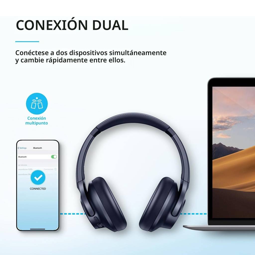 Auriculares inalámbricos over-ear con cancelación activa de ruido, gran autonomía y sonido potente. Incorporan Bluetooth 5.3 optimizado, ecualización personalizada vía app y opción de conexión por cable 3.5 mm para mayor versatilidad.