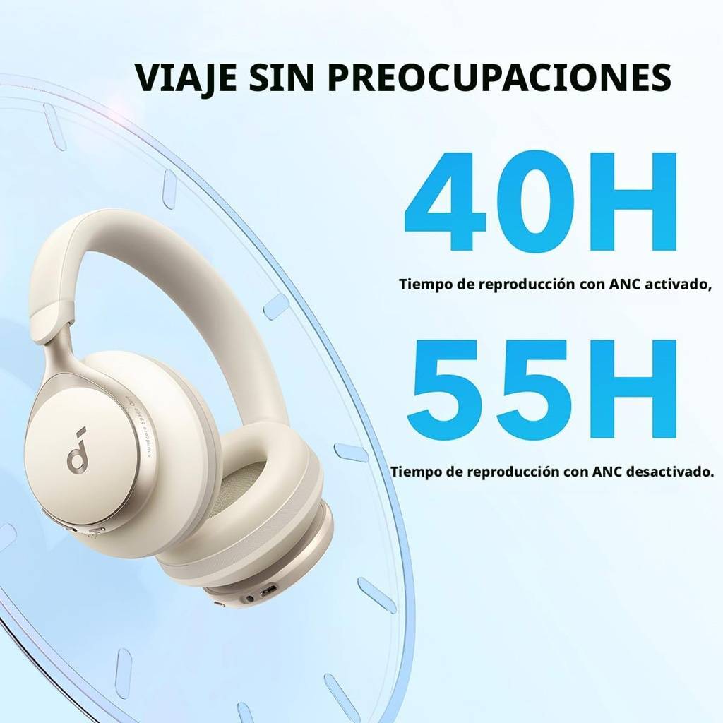 Los Soundcore Space One están diseñados para quienes buscan una experiencia de audio inmersiva, silenciosa y cómoda durante todo el día. Incorporan cancelación activa de ruido adaptativa (ANC) capaz de reducir hasta un 98 % del ruido ambiente, con una reducción de voz 2 veces más efectiva frente a modelos anteriores, ideal para viajes, trabajo o estudio. Sus drivers de 40 mm con soporte LDAC ofrecen audio inalámbrico de alta resolución, mientras que su autonomía de hasta 55 horas garantiza largas sesiones sin interrupciones. Todo esto en un diseño elegante, liviano y certificado para un uso confortable y sostenible.