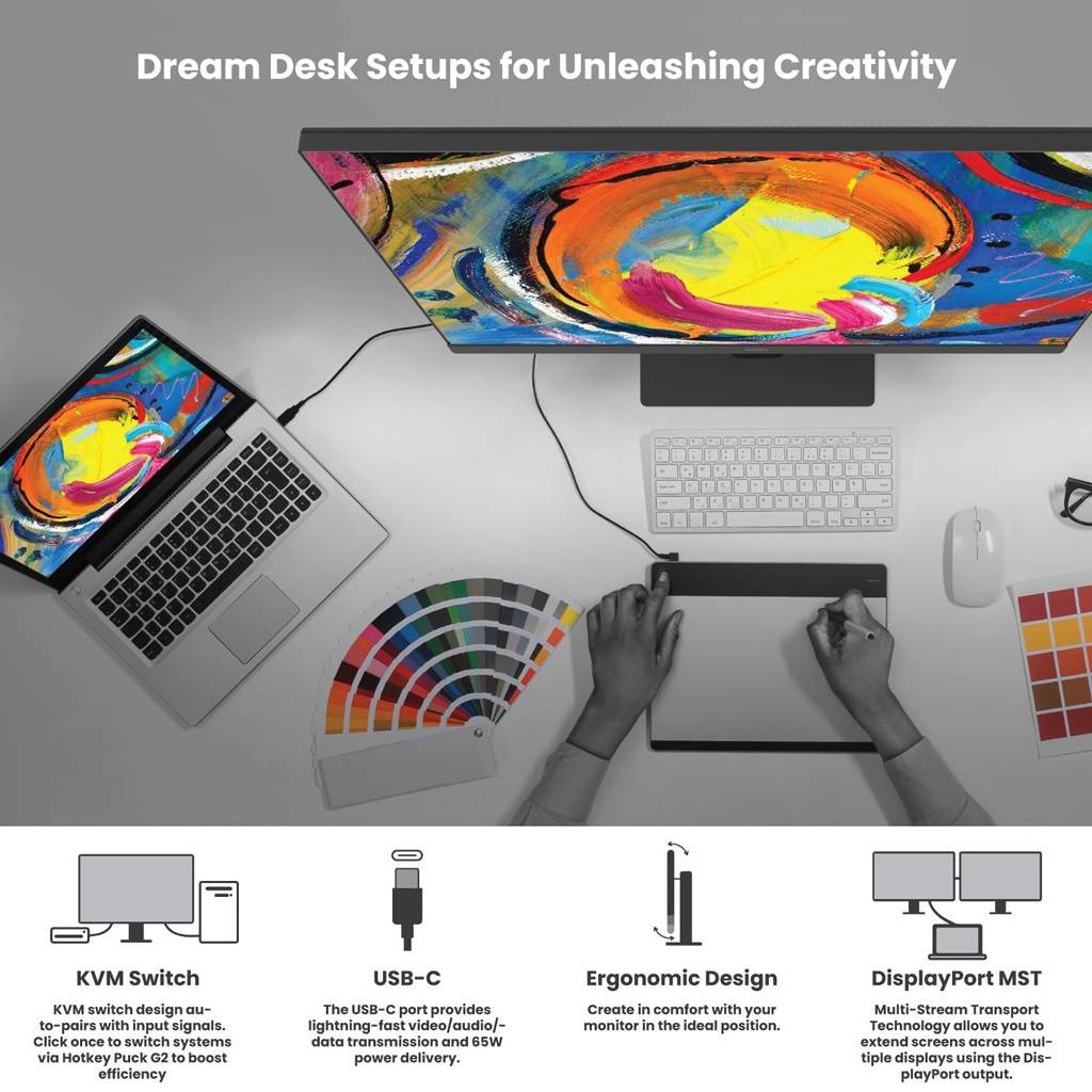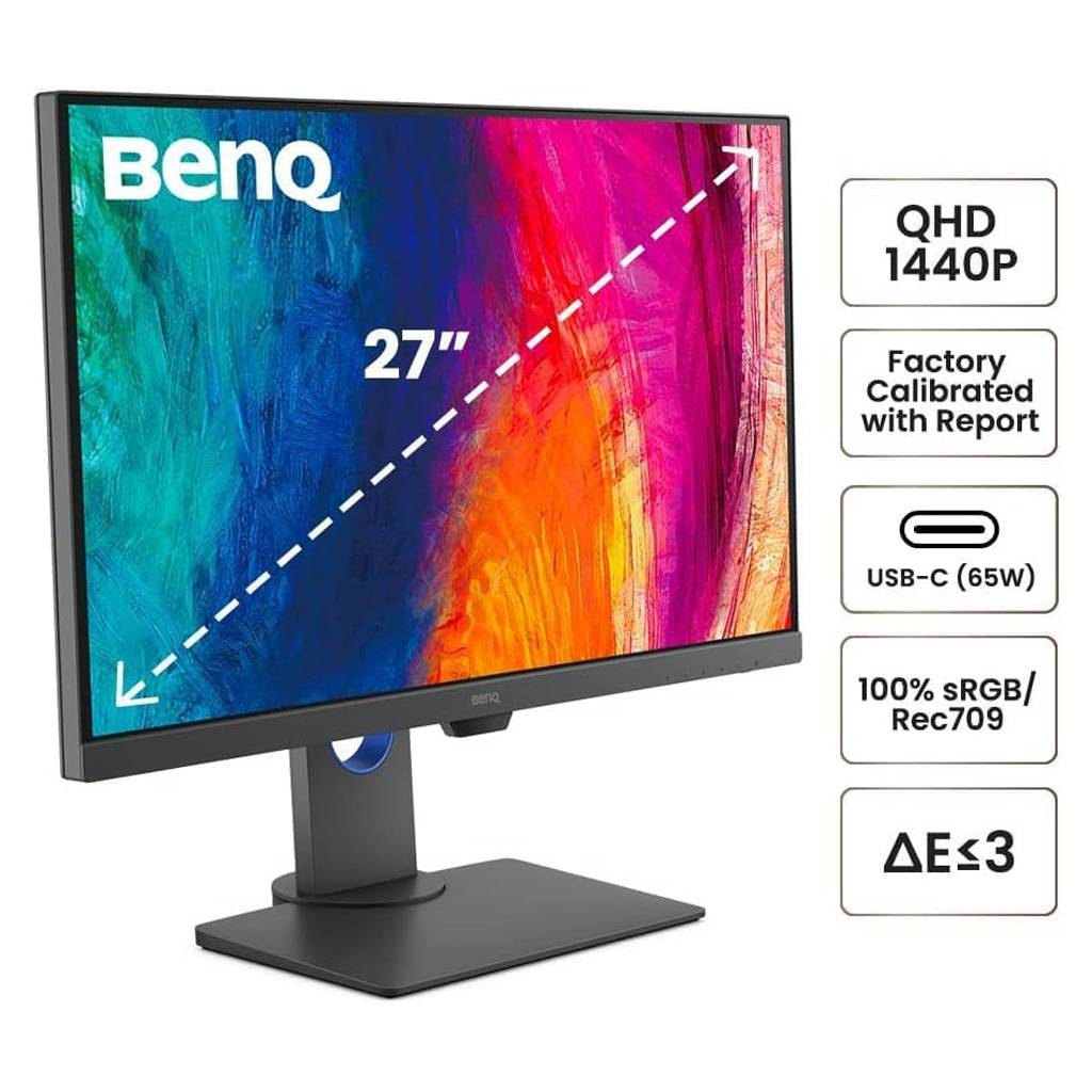 El monitor BenQ PD2705Q está diseñado para diseñadores gráficos y profesionales que necesitan alta precisión de color en un entorno de trabajo eficiente. Con su panel IPS QHD de 27", calibración de fábrica y cobertura de color 100 % sRGB / Rec.709, ofrece imágenes precisas y consistentes. La conectividad USB-C de 65 W, junto con DisplayPort, HDMI y el conmutador KVM, permite un flujo de trabajo flexible y organizado, mientras que su diseño ergonómico asegura comodidad durante largas jornadas frente al monitor.