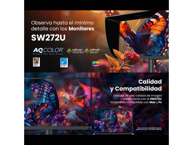 El monitor BenQ SW272U está diseñado para fotógrafos y profesionales de la imagen que buscan la máxima precisión y coherencia cromática en resolución 4K UHD. Su panel Nano Mate con textura similar al papel ofrece una experiencia visual natural y sin reflejos, ideal para edición fotográfica profesional. Con una cobertura del 99 % Adobe RGB y 100 % sRGB, calibración de hardware y conectividad USB-C de 90 W, garantiza un flujo de trabajo fluido y colores fieles desde la captura hasta la impresión.