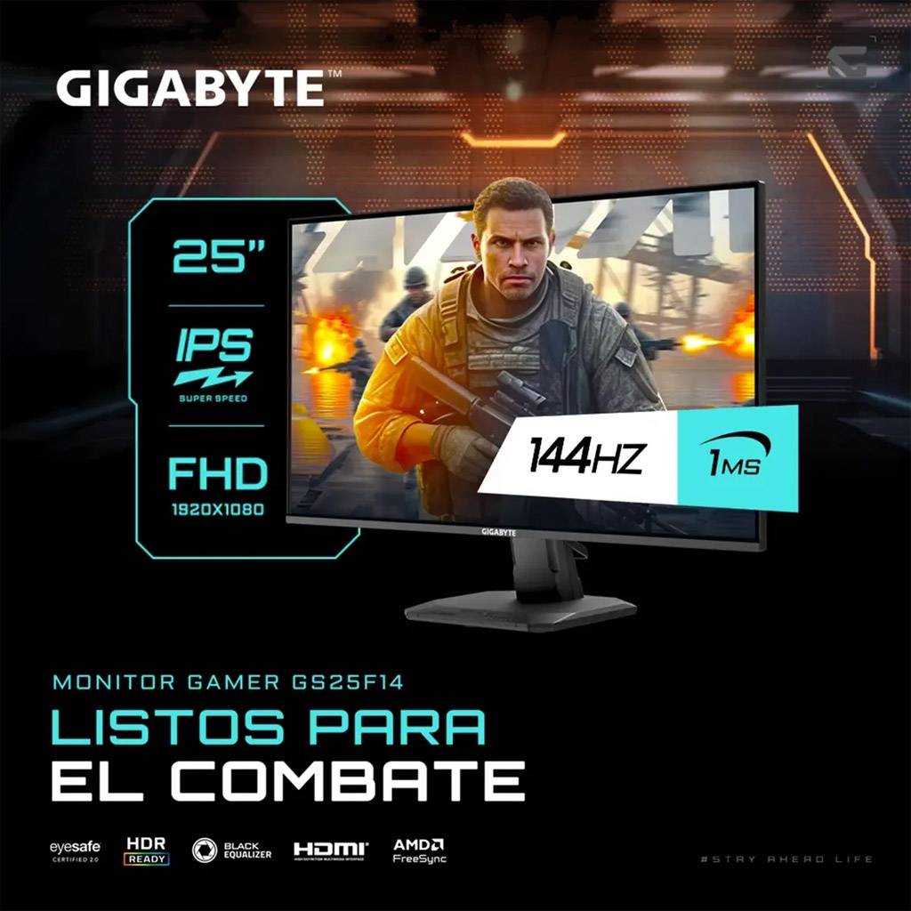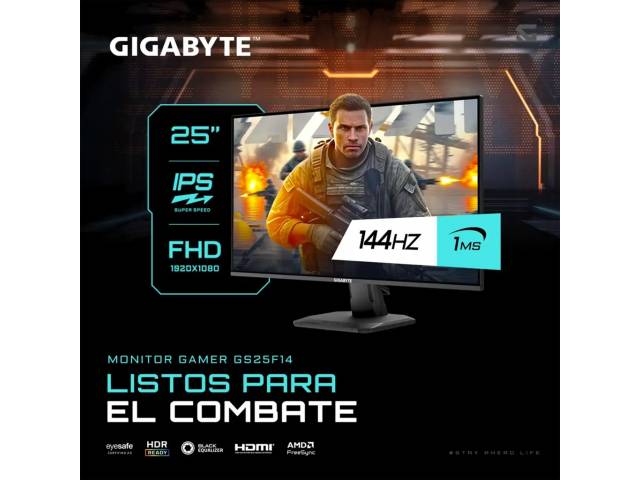 El monitor Gigabyte GS25F14 es una opción ideal para gaming competitivo y uso diario, combinando un panel IPS de 24.5" con frecuencia de actualización de 144Hz y tiempo de respuesta de 1 ms. Ofrece imágenes fluidas, colores precisos y compatibilidad con HDR10, logrando una experiencia visual equilibrada tanto para juegos como para contenido multimedia.