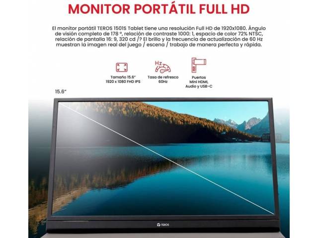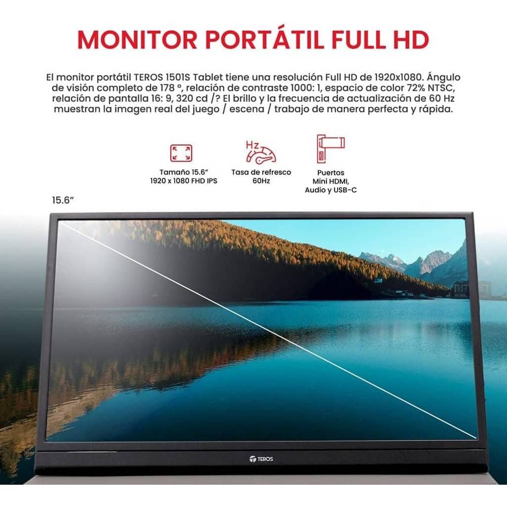 El Teros TE‑1501S es un monitor portátil de 15.6" diseñado para ampliar tu espacio de trabajo o entretenimiento en cualquier lugar. Su panel FHD IPS ofrece imágenes nítidas, colores equilibrados y amplios ángulos de visión, ideal para productividad, estudios, presentaciones y contenido multimedia. Su cuerpo delgado y liviano lo hace perfecto para usuarios que requieren movilidad sin sacrificar calidad visual, con compatibilidad multiplataforma mediante puertos USB-C y Mini HDMI.