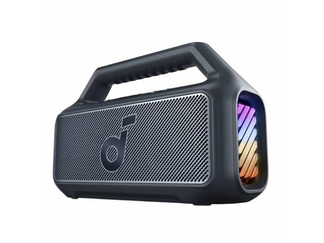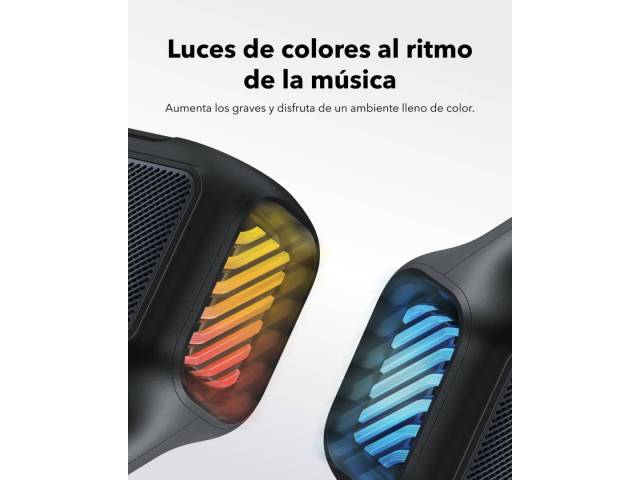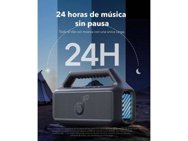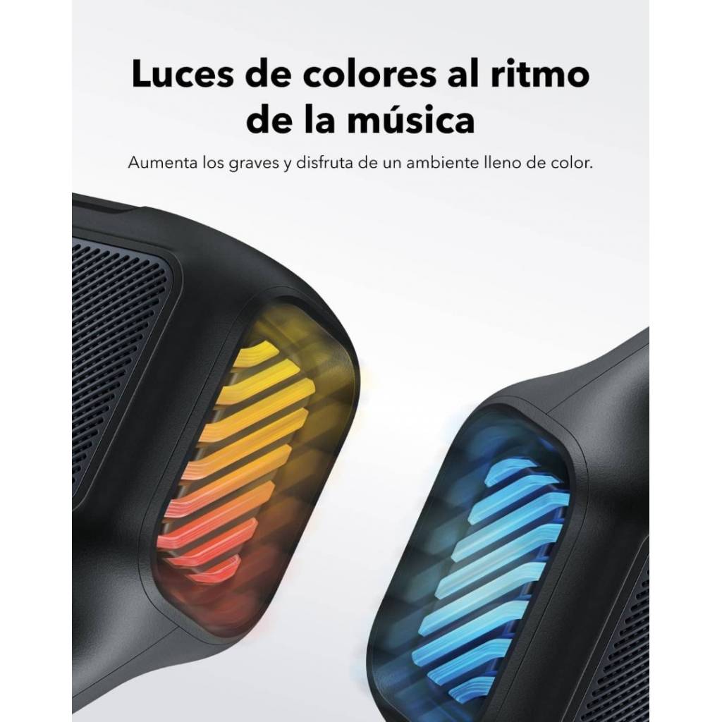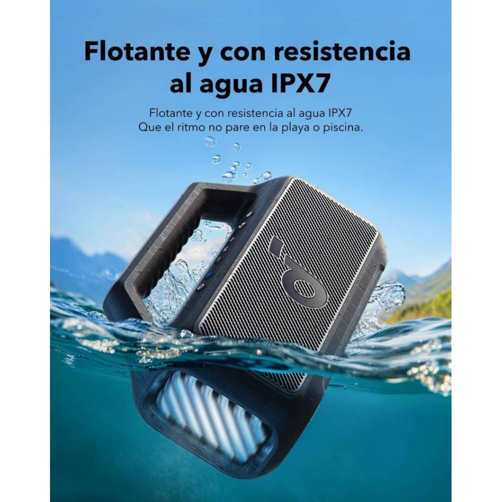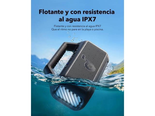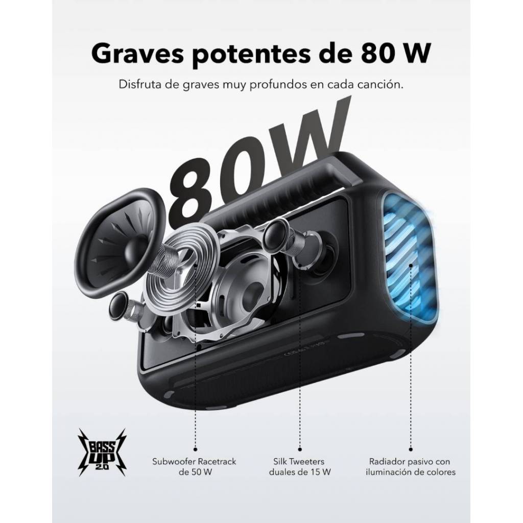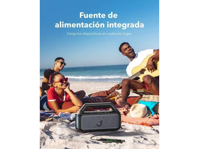 El Soundcore Boom 2 es un parlante Bluetooth de alto rendimiento diseñado para exteriores, con potencia real de hasta 80 W, sonido estéreo 2.1 y graves profundos gracias a la tecnología BassUp 2.0. Su batería de larga duración ofrece hasta 24 horas de reproducción, incorpora función power bank para cargar otros dispositivos y cuenta con resistencia IPX7, siendo además flotante. Las luces LED personalizables y el ecualizador ajustable completan una experiencia potente, versátil y totalmente personalizable.