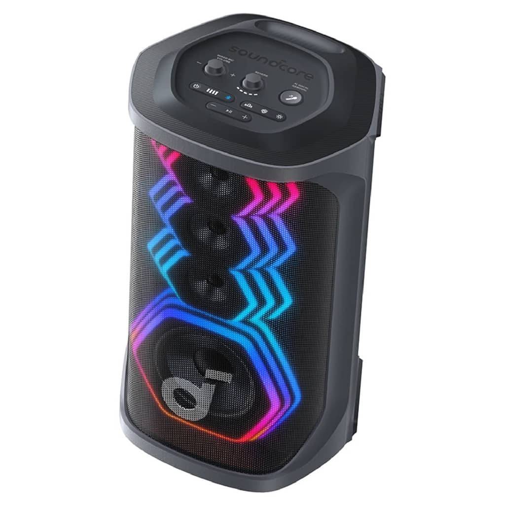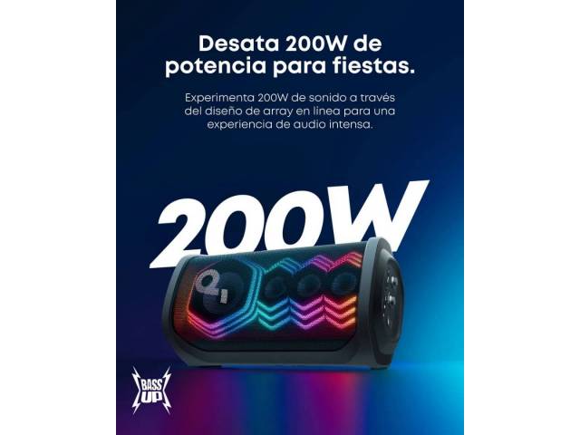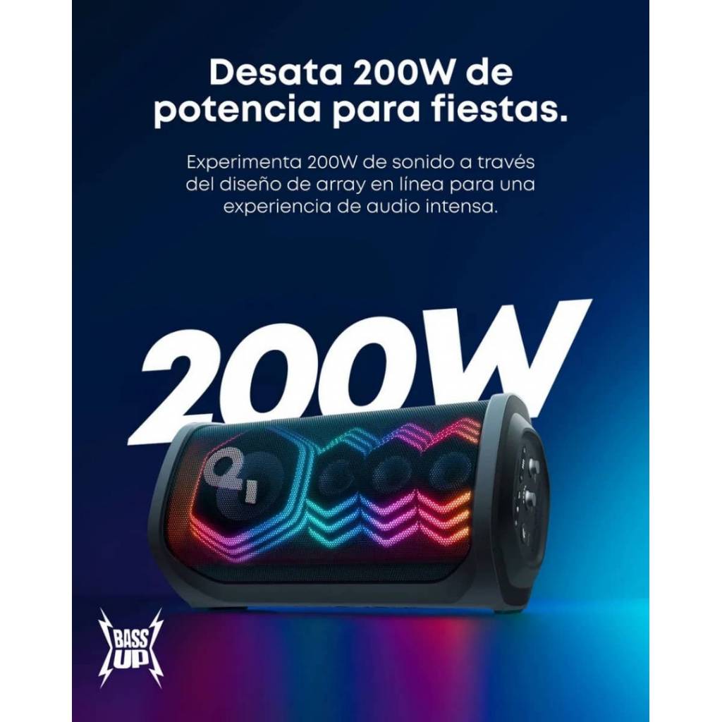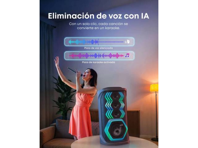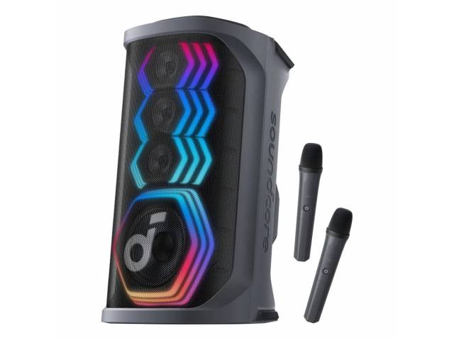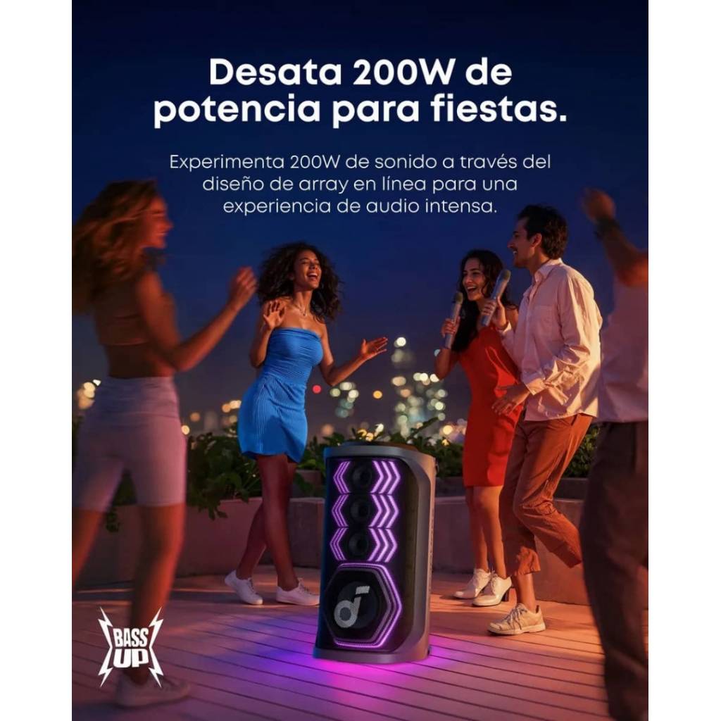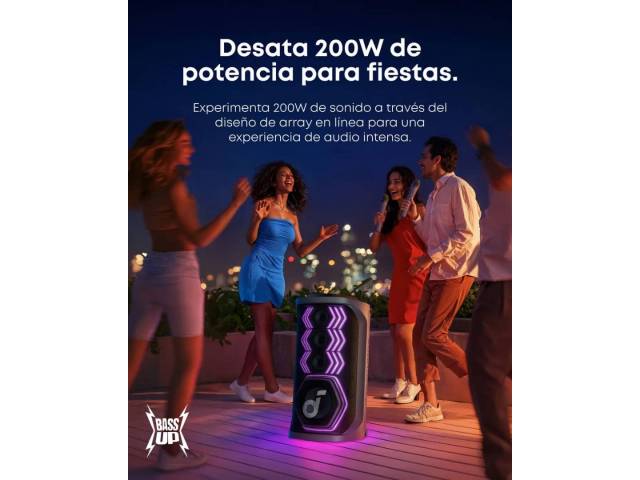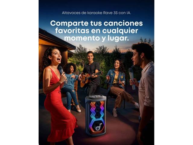 El Soundcore Rave 3S es un parlante de fiesta de alto impacto diseñado para karaoke, música y eventos sociales. Ofrece 200 W de potencia, un sonido potente y profundo gracias a su woofer de gran tamaño, un show de luces sincronizadas con el ritmo, y funciones inteligentes como eliminación de voz por IA para convertir cualquier canción en karaoke al instante. Incluye dos micrófonos inalámbricos, controles dedicados para voz y efectos, y resistencia IPX4 para uso sin preocupaciones en interiores o exteriores.
