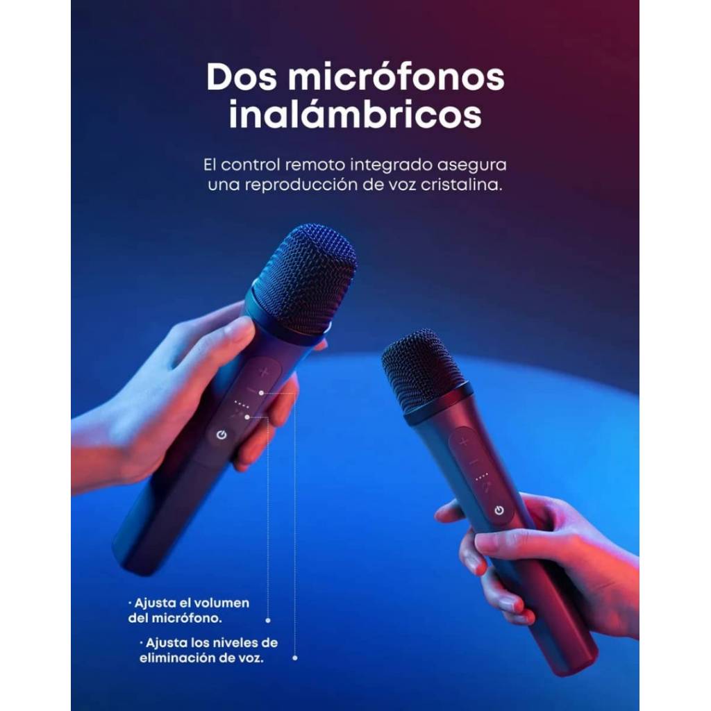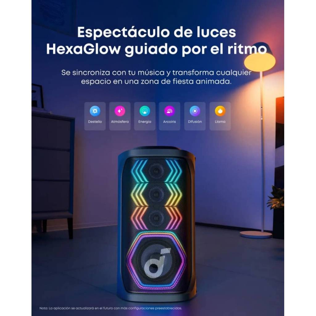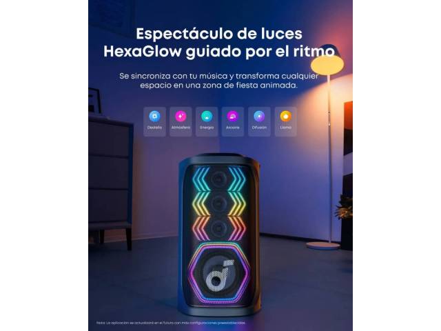 Aplicación: Soundcore App (ecualizador, luces, micrófonos y efectos)