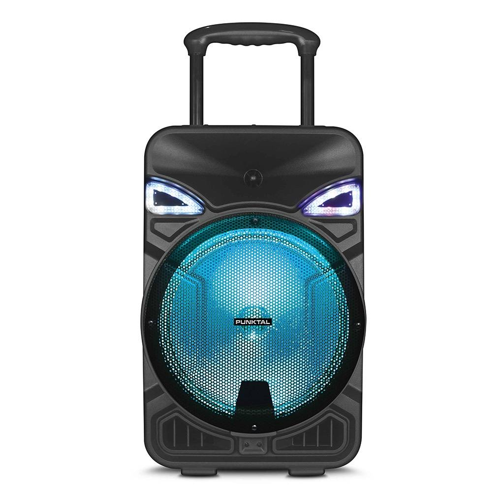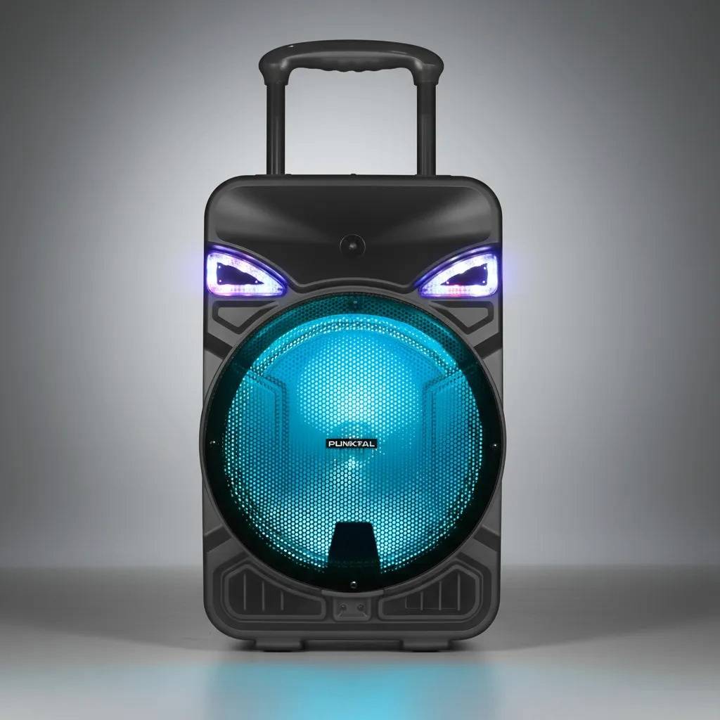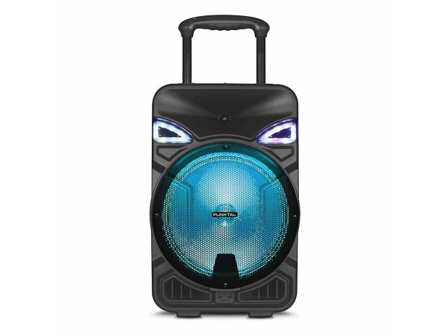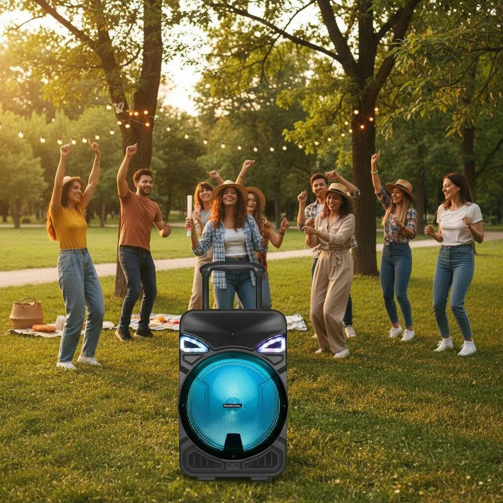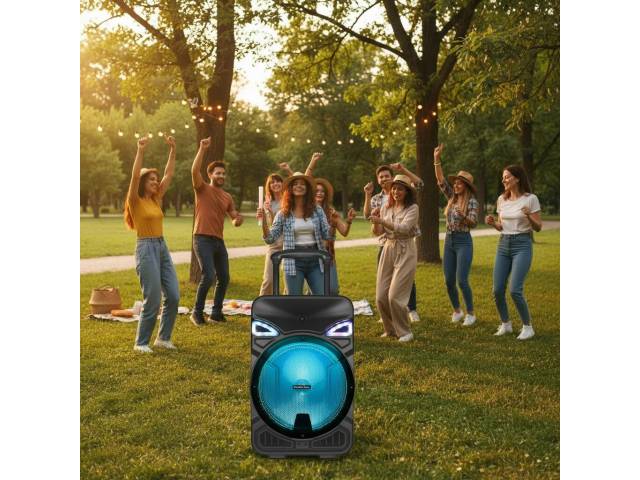 Parlante activo portátil de 12" con batería interna recargable, ideal para eventos, reuniones y karaoke. Ofrece alta potencia PMPO, conectividad Bluetooth, múltiples opciones de reproducción, radio FM, iluminación LED frontal y control remoto, incluyendo micrófono para uso inmediato y asa de transporte para mayor comodidad.