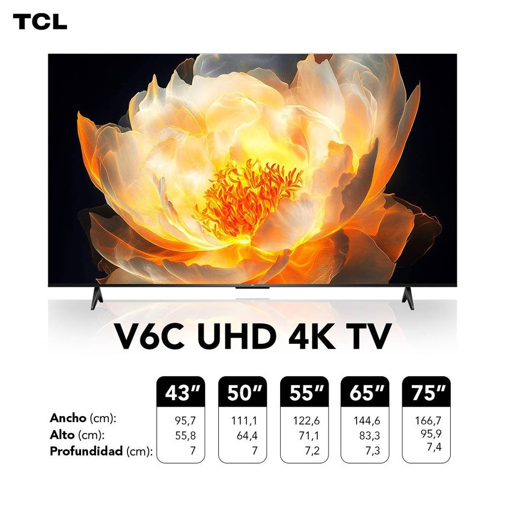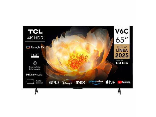 El televisor TCL 65" V6C ofrece una experiencia visual inmersiva gracias a su panel Direct LED 4K UHD y tecnología HDR10+, que optimiza el contraste y resalta cada detalle. Su sistema Google TV permite acceder fácilmente a tus aplicaciones, series y películas favoritas, mientras que el diseño sin bisel metálico realza el estilo de cualquier ambiente.