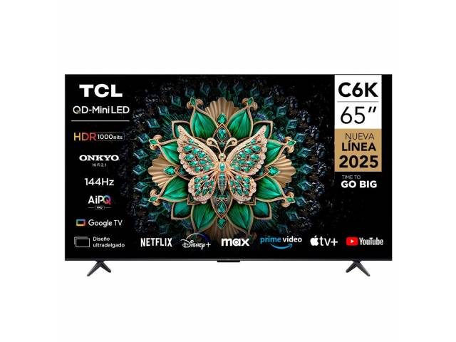 El televisor TCL 65" C6K es un Smart TV QLED / QD-Mini LED 4K con 144 Hz nativos, sonido ONKYO 2.1 y Google TV, ideal para cine, deportes y gaming fluido.