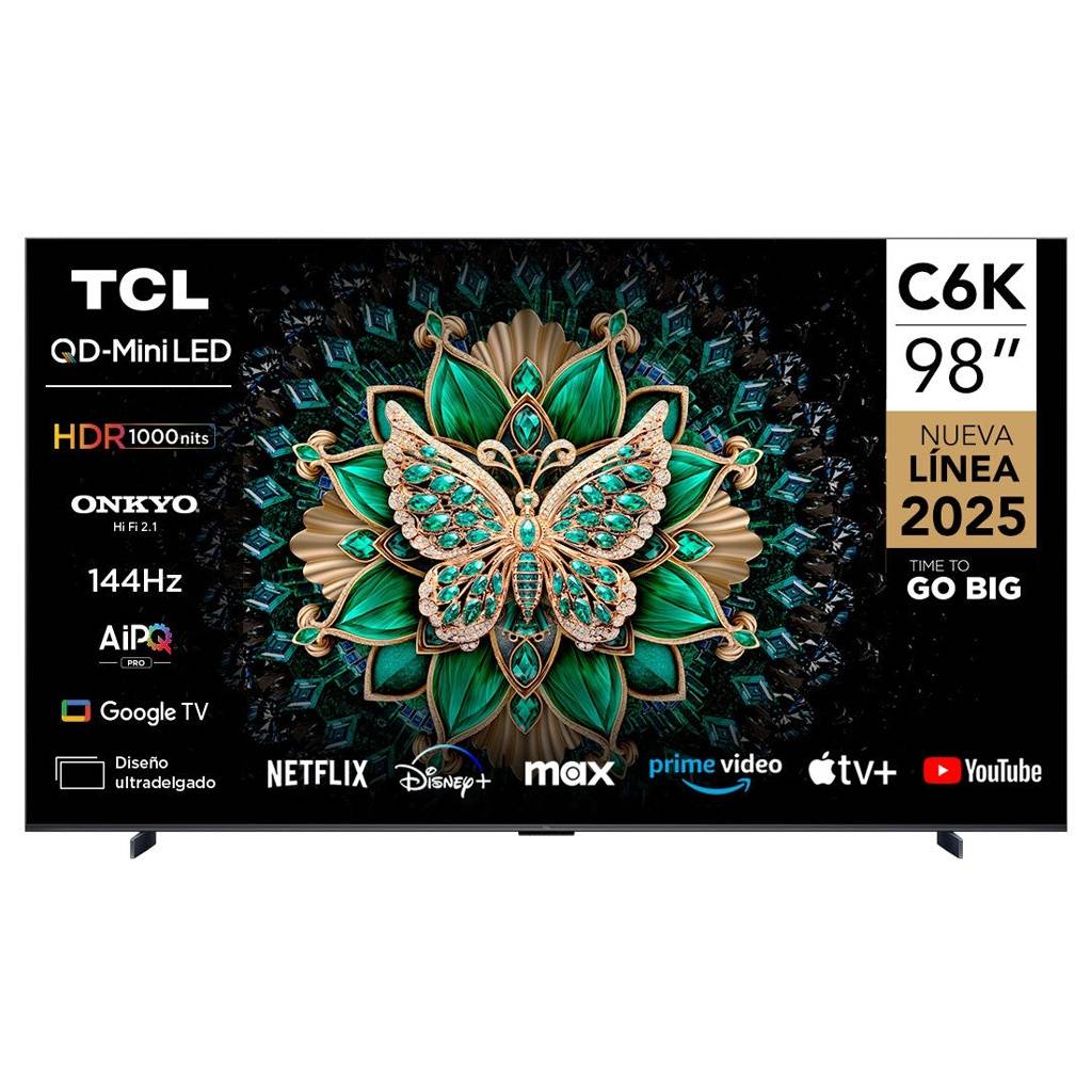 El televisor TCL 98" C6K es un Smart TV QLED / QD-Mini LED 4K con 144 Hz nativos, sonido ONKYO 2.1 y Google TV, ideal para cine, deportes y gaming fluido.