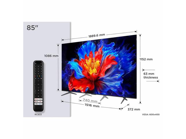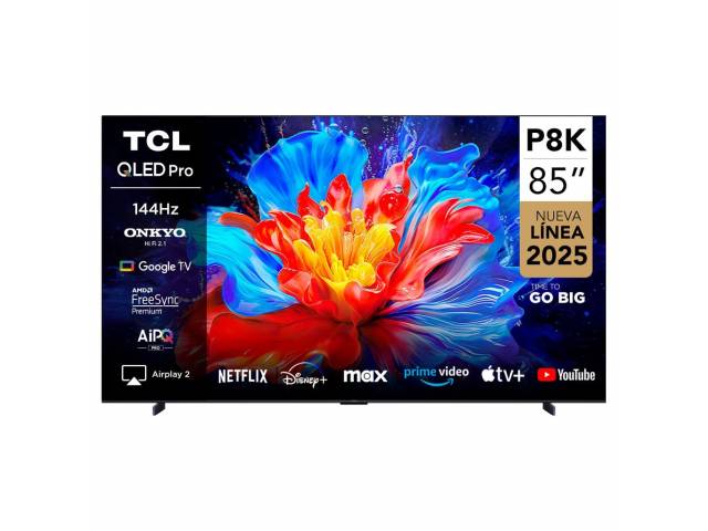 El televisor TCL 85" P8K es un Smart TV QLED 4K UHD con alta tasa de refresco y sonido potente, ideal para cine en casa, deportes y gaming fluido.