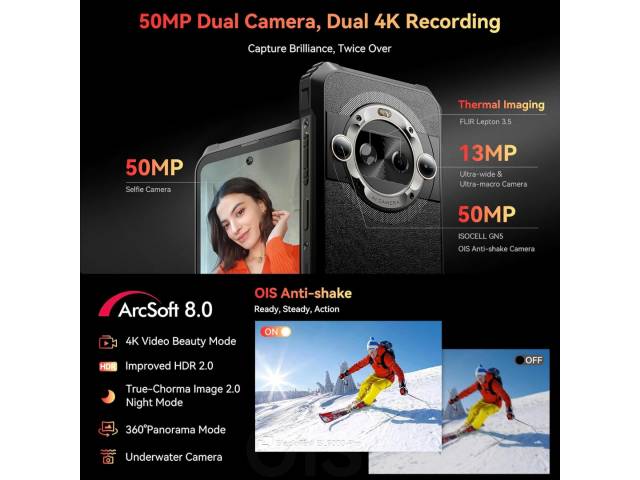 Cámaras traseras: triple – 50 MP (PDAF, gran angular 1/1.57″) + 13 MP (ultra gran angular 120° AF) + cámara térmica FLIR Lepton 3.5 / flash LED / HDR / Panorama