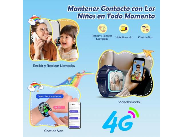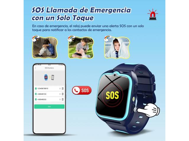 - Seguridad: GPS/WiFi/LBS para ubicación en tiempo real, botón SOS para emergencias, recordatorios de área segura (cerca/lejos) y de batería baja.