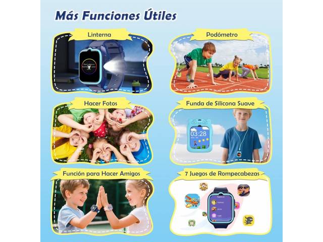 - Funciones para Niños: Cámara, álbum de fotos, despertador, calculadora, juegos, podómetro, linterna.