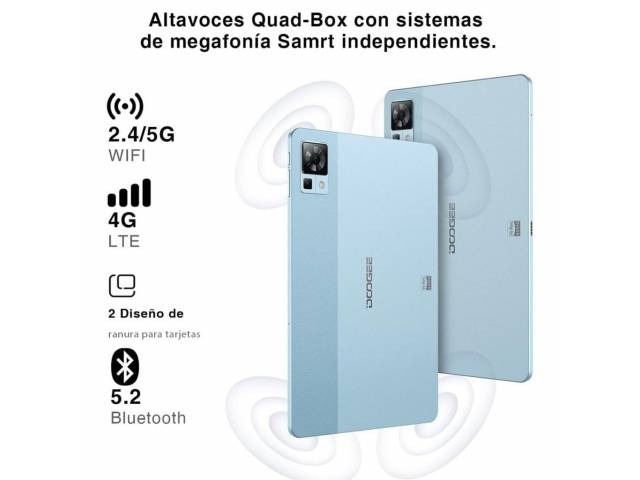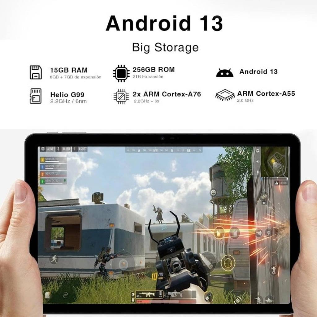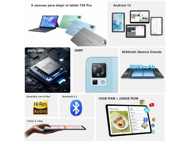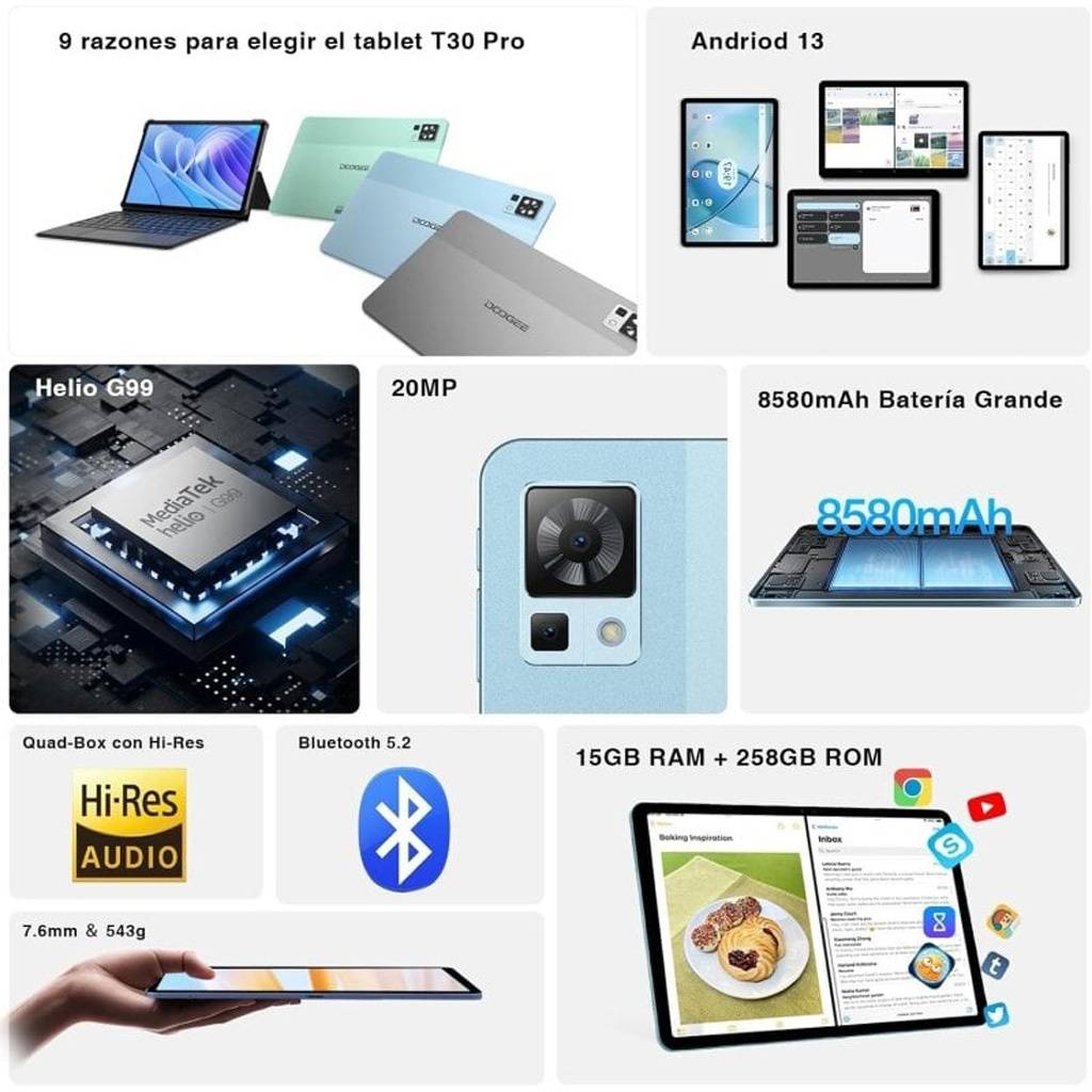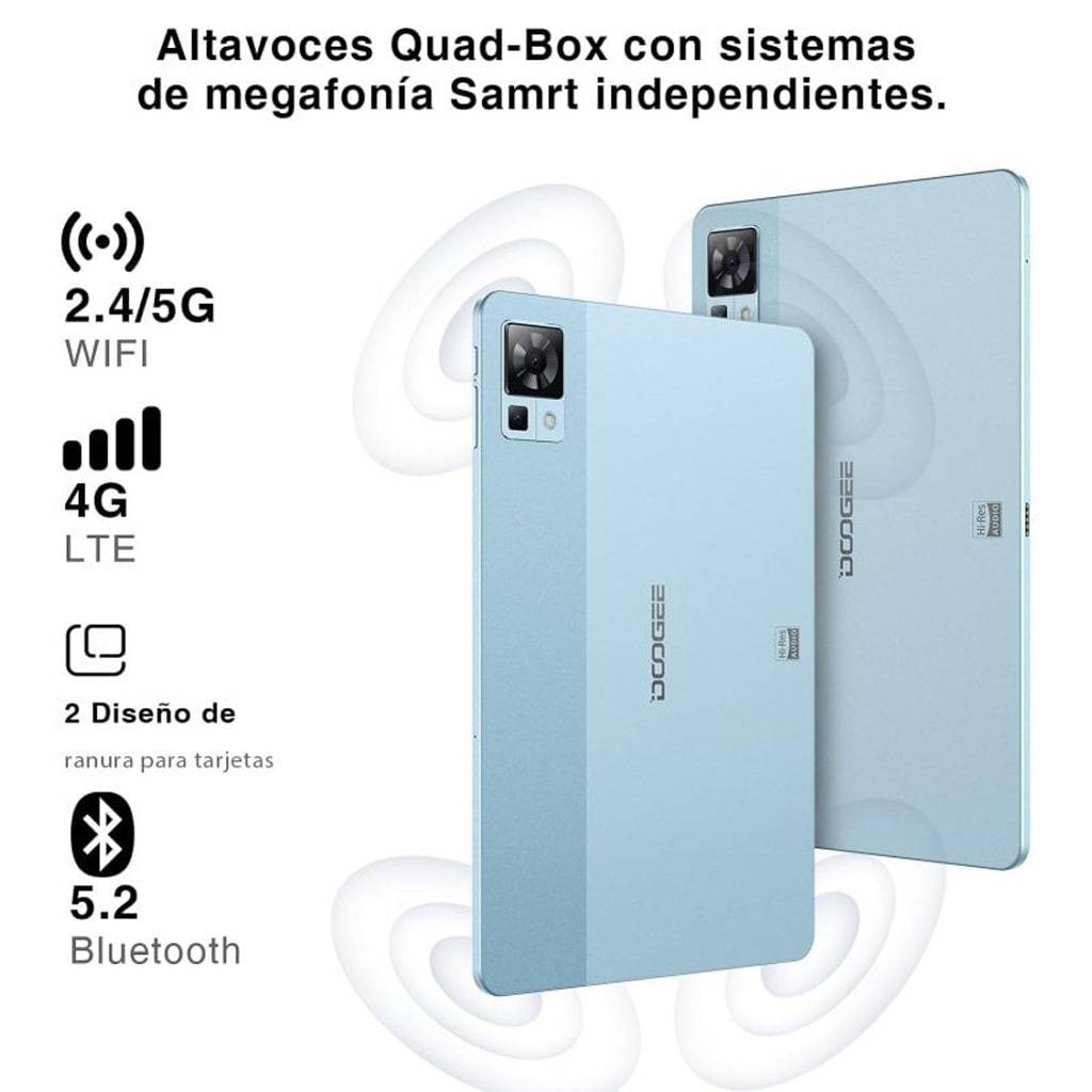 La DOOGEE T30 Pro es una tablet de alto rendimiento diseñada para ofrecer una experiencia inmersiva en juegos, multimedia y productividad. Equipada con el procesador MediaTek Helio G99 de 8 núcleos fabricado en 6 nm, ofrece una gran eficiencia y potencia para tareas exigentes. Su pantalla de 11 pulgadas con resolución 2.5K y certificación TÜV Low Blue Light brinda una calidad visual excepcional, ideal para largas sesiones de uso. Incorpora 15 GB de RAM (8 GB físicos + 7 GB virtuales) y 256 GB de almacenamiento interno ampliables hasta 2 TB, junto con una batería de 8580 mAh con carga rápida de 33 W. Sus tres cámaras (20 MP principal, 8 MP frontal y 2 MP macro) ofrecen gran detalle en fotos y videollamadas. Además, cuenta con conectividad Dual 4G LTE, WiFi 5 GHz, Bluetooth 5.0, sonido envolvente con 4 altavoces y certificación Widevine L1, ofreciendo un equilibrio perfecto entre potencia, entretenimiento y portabilidad.