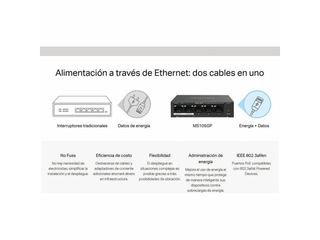 - Dos cables en uno: con cuatro puertos PoE+, transfiere datos y energía en un solo cable