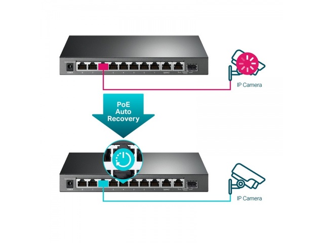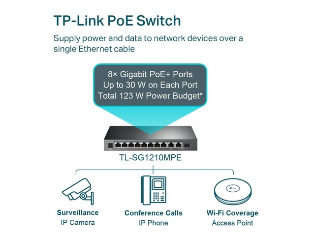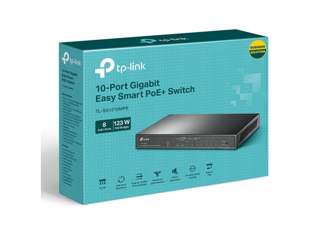 TP-Link TL-SG1210MPE es un conmutador inteligente sencillo con 9 puertos Gigabit RJ45 y 1 puerto Gigabit combinado SFP / RJ45 que no requiere configuración. Con 8 puertos PoE (Power over Ethernet), puede detectar y suministrar energía automáticamente con todos los dispositivos alimentados (PD) compatibles con IEEE 802.3af / at. En esta situación, la energía eléctrica se transmite junto con los datos en un solo cable, lo que le permite expandir su red donde no hay líneas eléctricas o enchufes, donde desea reparar dispositivos como AP, cámaras IP o teléfonos IP, etc.
