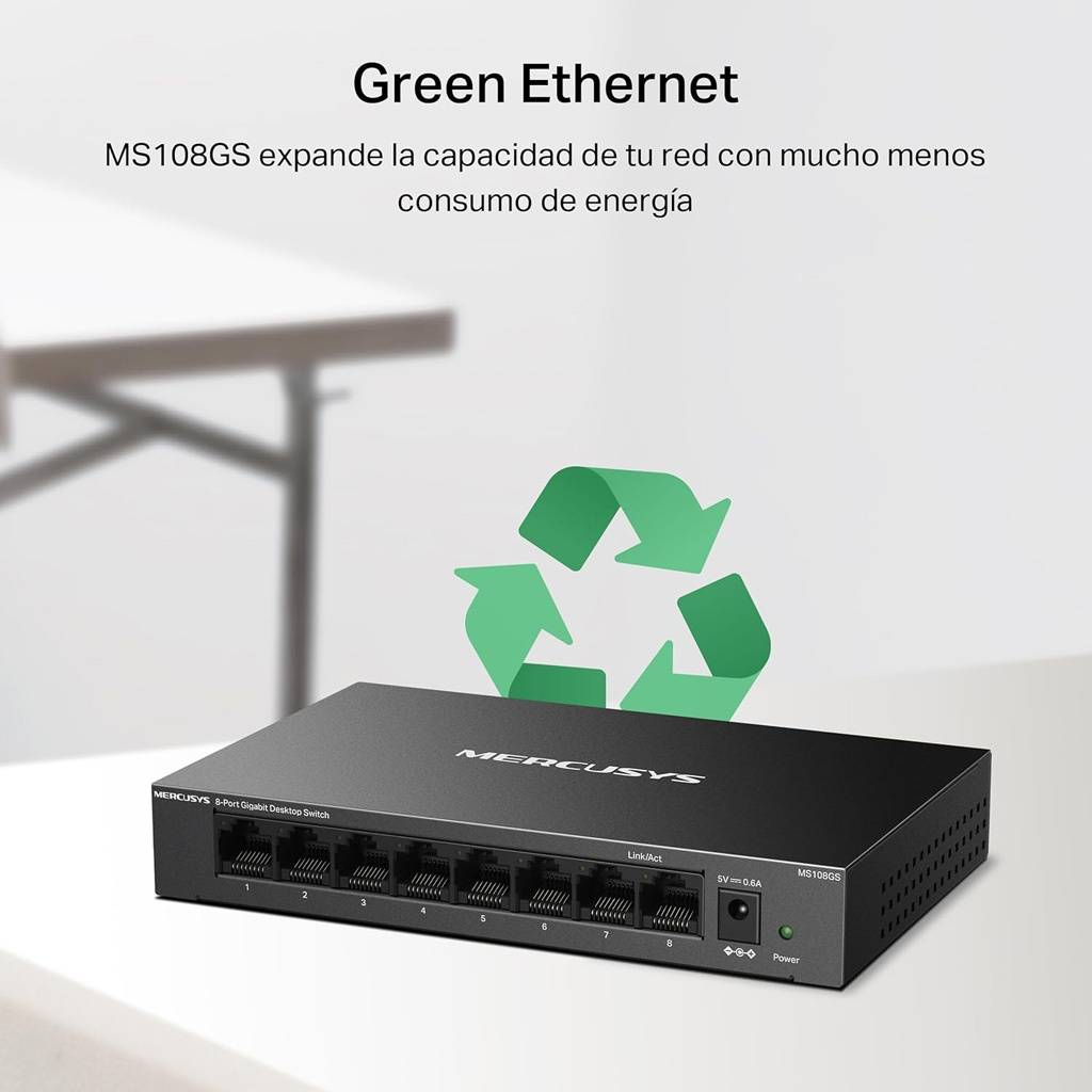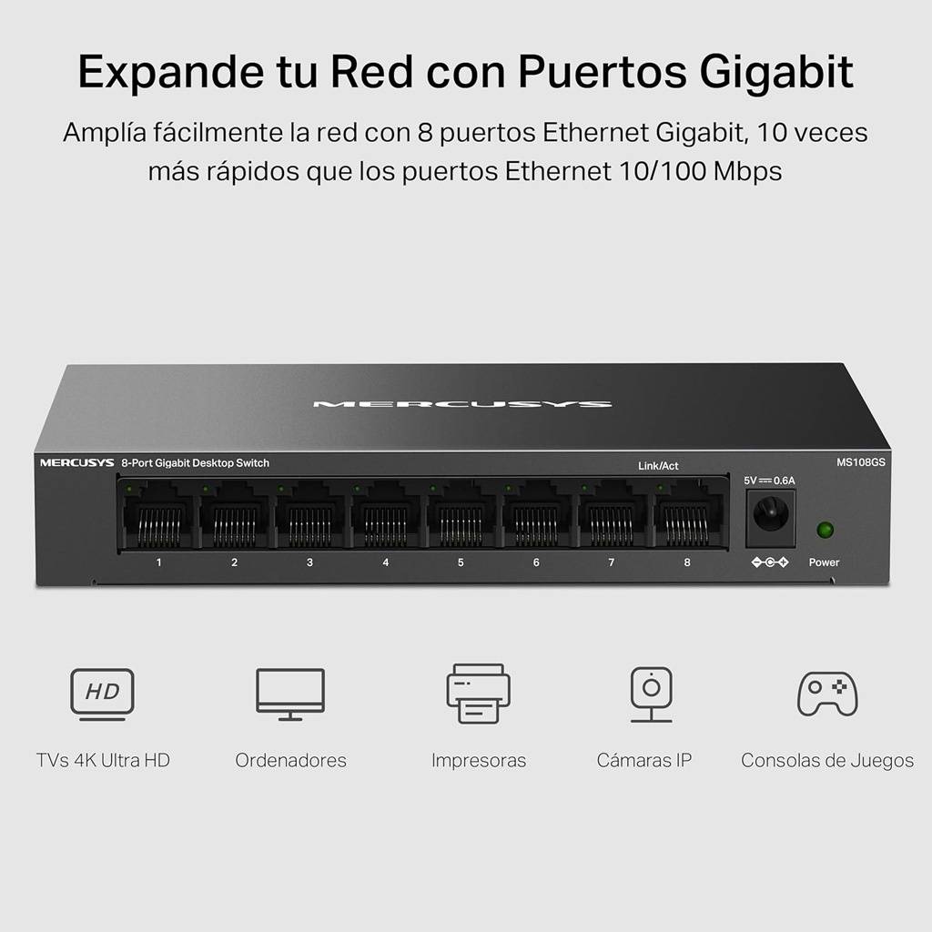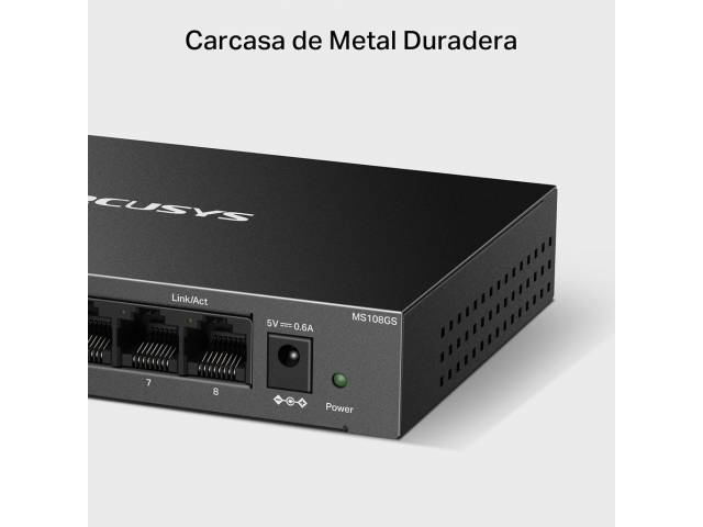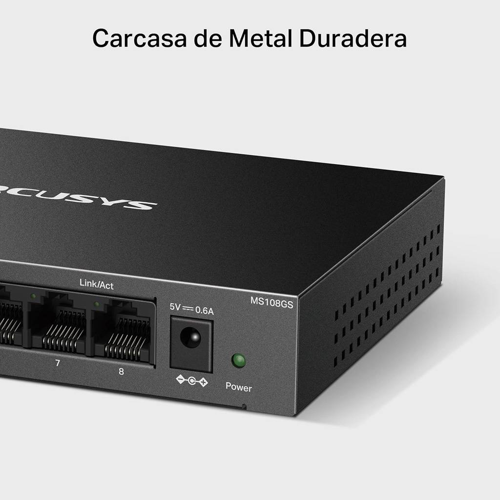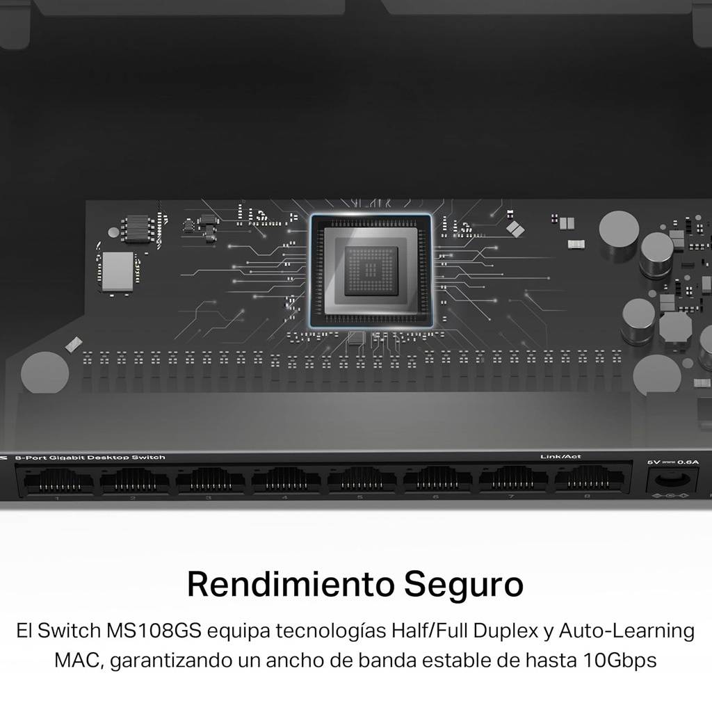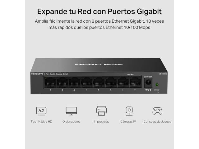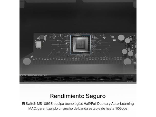 - Puertos Gigabit Completos: 8 × 10/100/1000 Mbps con Auto-Negociación en puertos RJ45 que soportan Auto-MDI/MDIX.