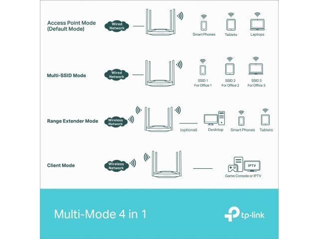 - Múltiples modos: Admite modos de punto de acceso, extensor de rango, SSID múltiple y cliente para satisfacer cualquier necesidad de red.