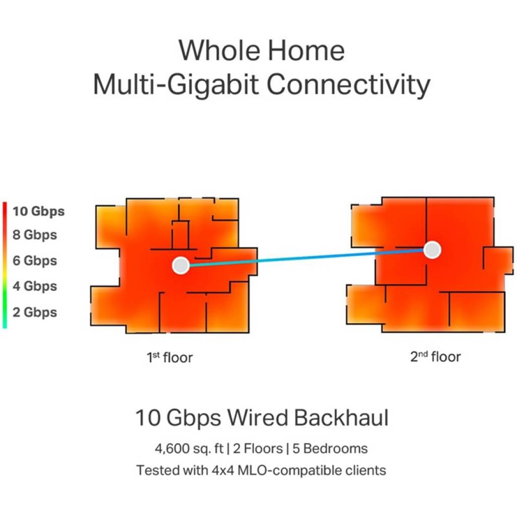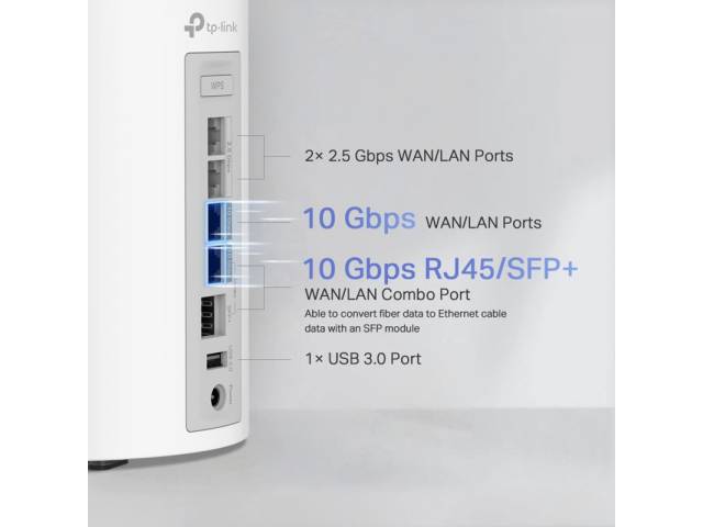Tribanda (6 GHz, 5 GHz, 2.4 GHz). 4 Puertos: 1×10Gbps + 1×SFP/RJ45 de 10Gbps + 2×2.5Gbps.