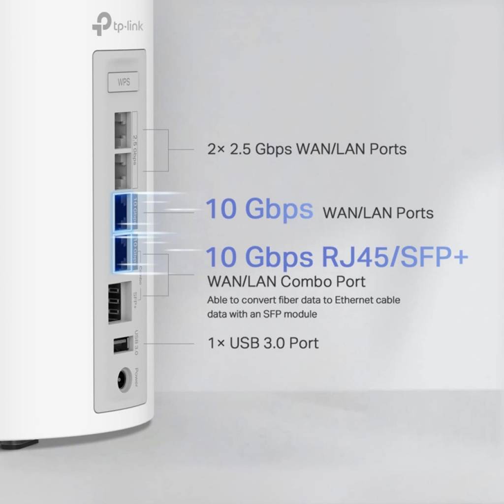 Tribanda (6 GHz, 5 GHz, 2.4 GHz). 4 Puertos: 1×10Gbps + 1×SFP/RJ45 de 10Gbps + 2×2.5Gbps.
