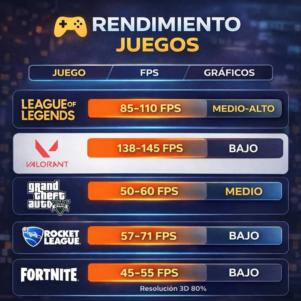 También puede ejecutar títulos competitivos menos exigentes como Valorant, CS:GO y Dota 2 con ajustes gráficos moderados o bajos, y juegos retro o clásicos sin dificultad.