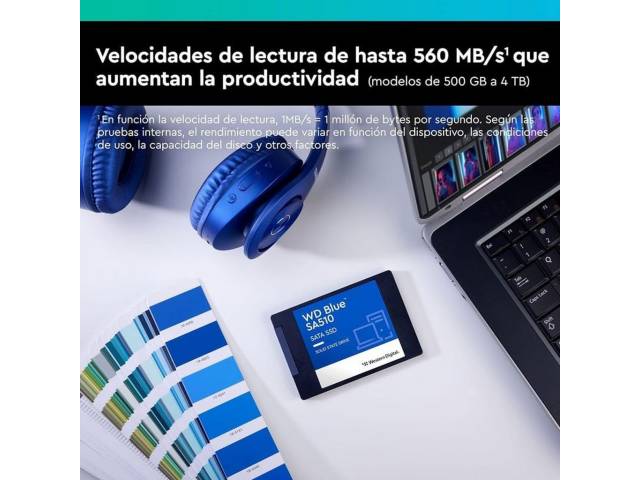El SSD Western Digital Blue SA510 de 500GB es una excelente opción para darle nueva vida a tu PC o notebook. Con velocidades de lectura de hasta 560 MB/s y escritura de hasta 520 MB/s, ofrece arranques más rápidos, transferencias ágiles y un rendimiento general mucho más fluido que un disco duro tradicional. Su formato de 2.5" con interfaz SATA III garantiza compatibilidad con la mayoría de los equipos, mientras que su resistencia de 200 TBW asegura una larga vida útil ideal para el uso diario.