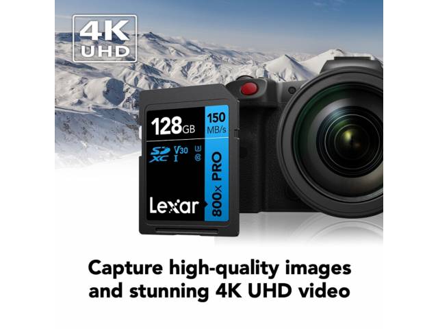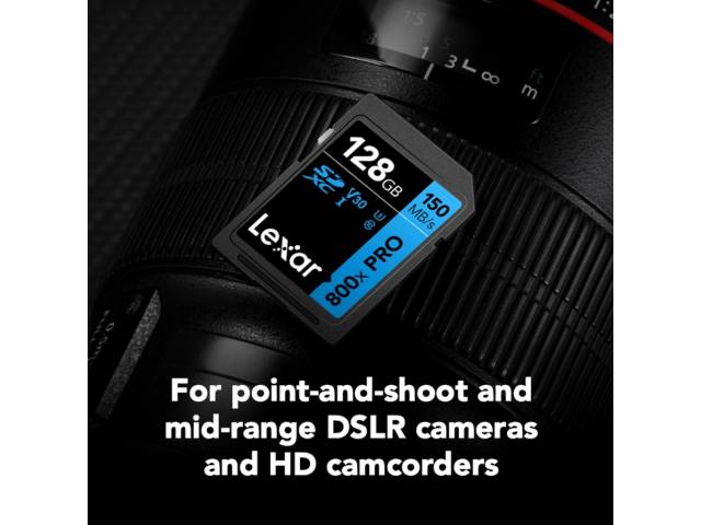 La memoria SDXC Lexar 800x Pro 128 GB Blue Series está diseñada para fotografía y video en alta calidad, ofreciendo velocidades confiables para capturar contenido sin interrupciones. Ideal para cámaras digitales, permite grabación en Full HD y 4K gracias a su clasificación U3 y V30, asegurando rendimiento estable y rápido.