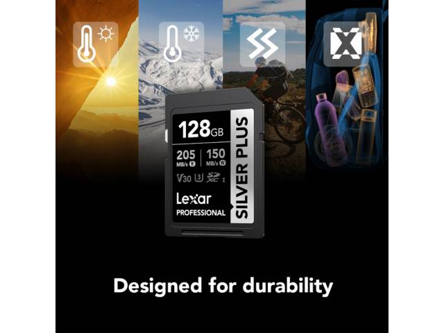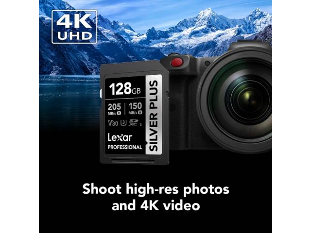 La memoria SDXC Lexar Professional Silver Plus 128 GB ofrece un excelente equilibrio entre rendimiento y capacidad, ideal para fotografía y video en alta calidad. Gracias a su clasificación U3 y V30, permite grabar contenido en Full HD y 4K con estabilidad, siendo una opción confiable para cámaras digitales y creadores de contenido.