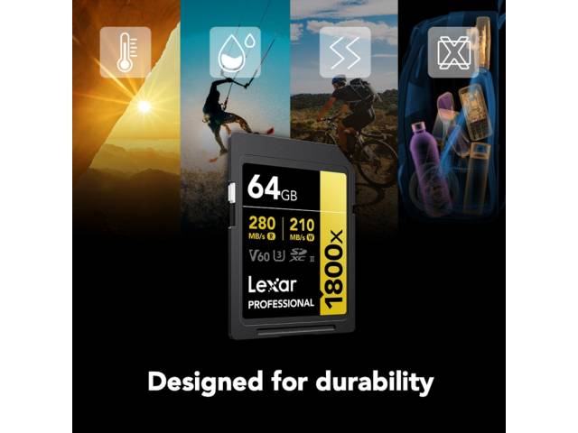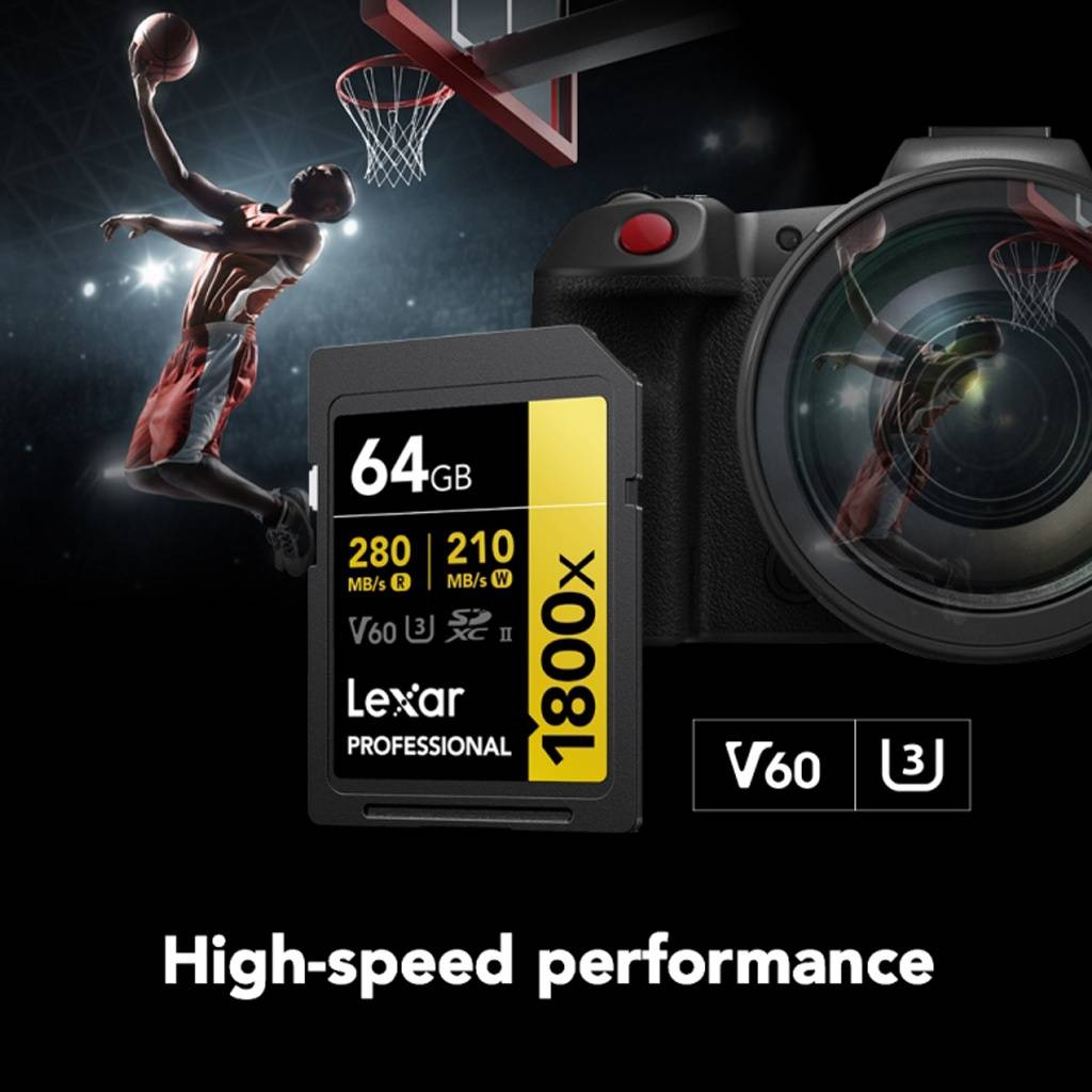 La memoria SDXC Lexar Professional 1800x 64 GB Gold Series está diseñada para fotógrafos y creadores de contenido que requieren alto rendimiento. Gracias a su interfaz UHS-II y clasificación V60, permite capturar ráfagas de imágenes y grabar video en alta resolución con total fluidez y velocidad.