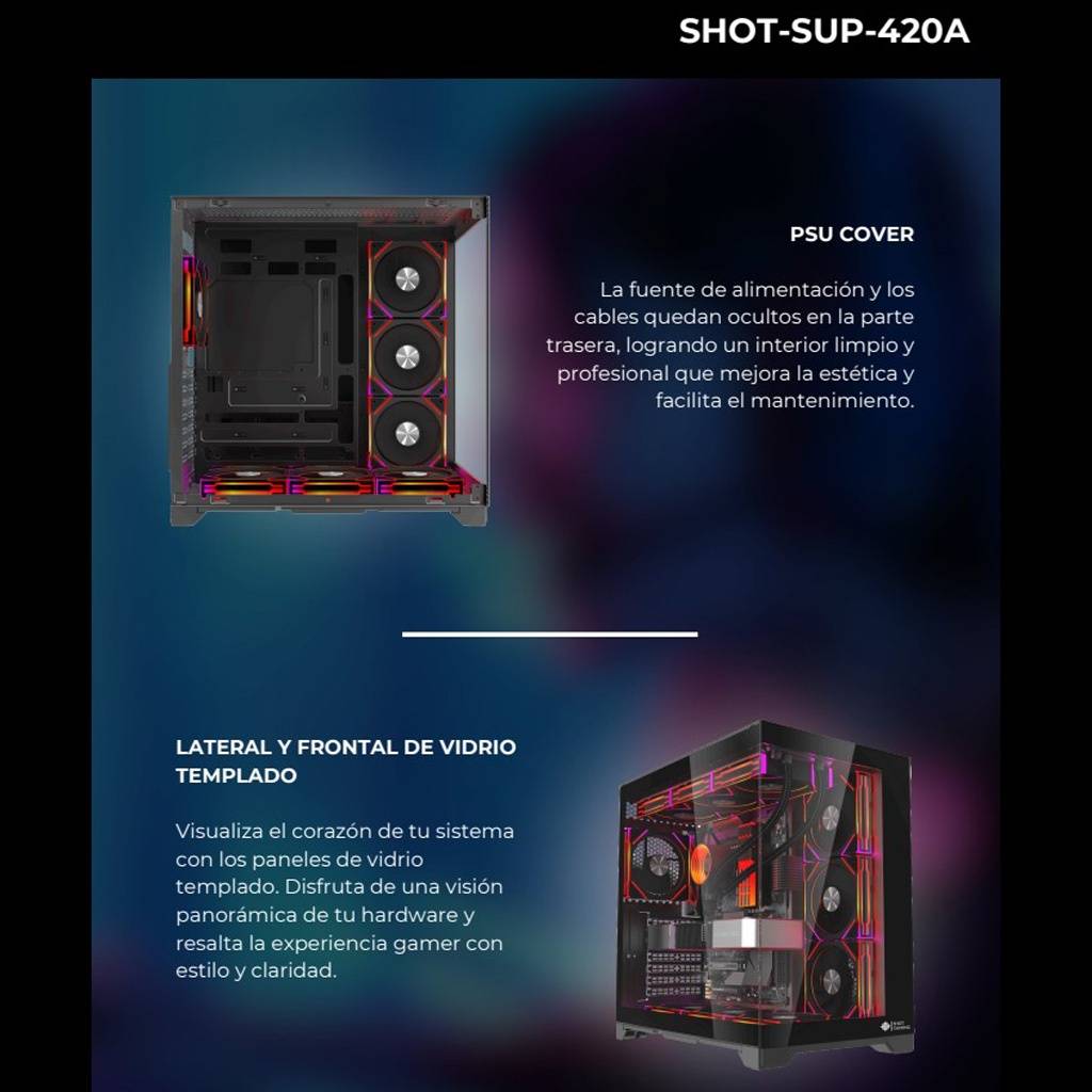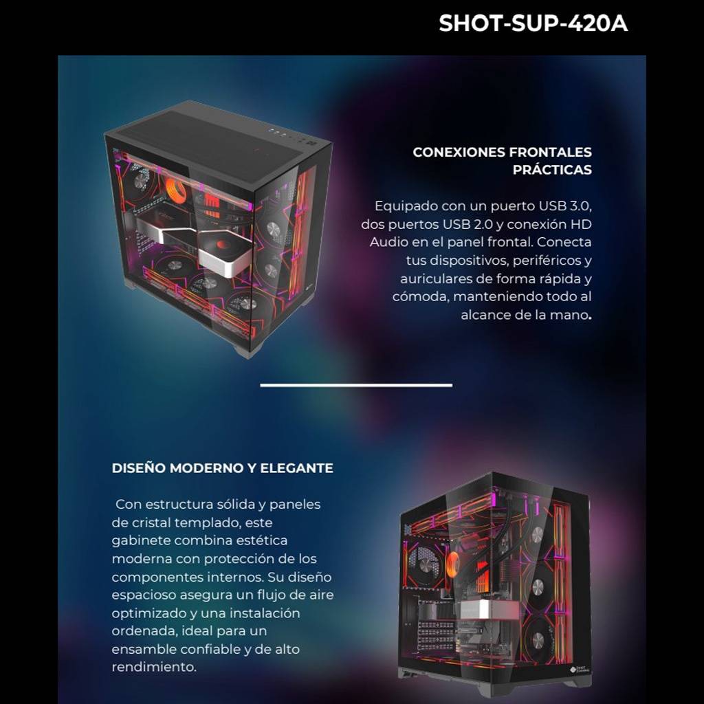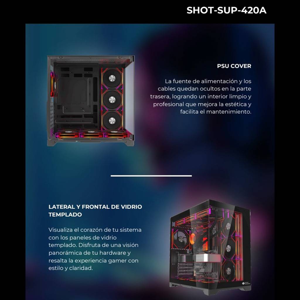 El SHOT-SUP-420A es un gabinete gamer tipo pecera con diseño moderno y paneles de vidrio templado en el frontal y lateral. Ofrece excelente ventilación, soporte para hasta diez ventiladores y espacio amplio para componentes de alto rendimiento, ideal para equipos ATX o Micro-ATX con armado prolijo gracias a su PSU Cover y estructura en acero SPCC.