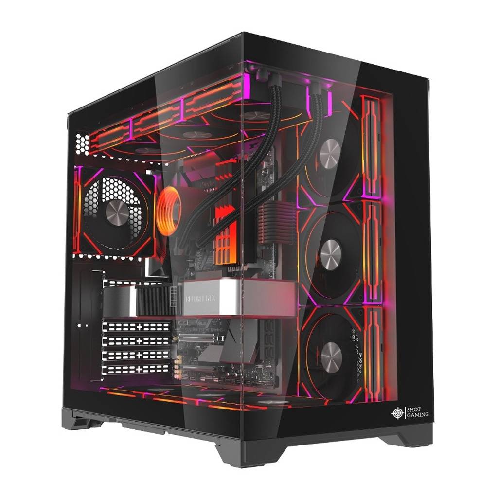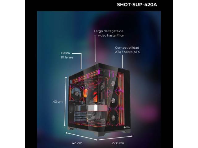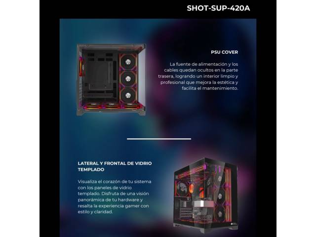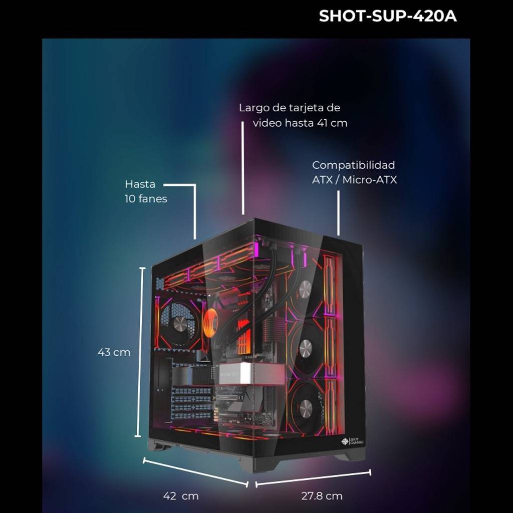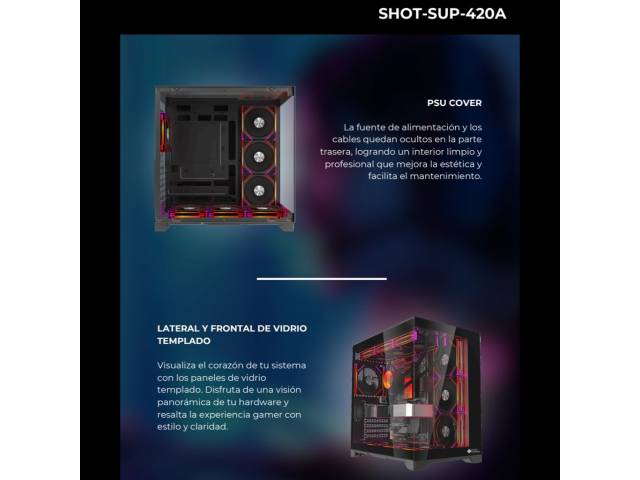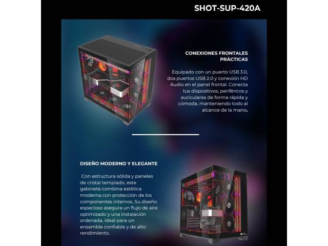 El SHOT-SUP-420A es un gabinete gamer tipo pecera con diseño moderno y paneles de vidrio templado en el frontal y lateral. Ofrece excelente ventilación, soporte para hasta diez ventiladores y espacio amplio para componentes de alto rendimiento, ideal para equipos ATX o Micro-ATX con armado prolijo gracias a su PSU Cover y estructura en acero SPCC.