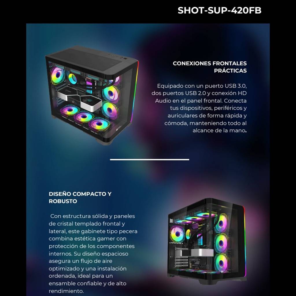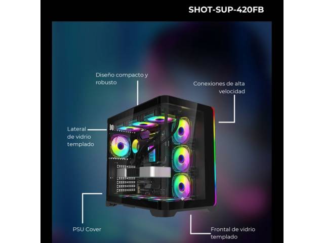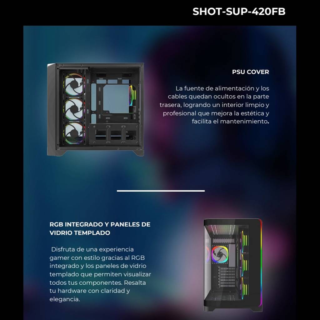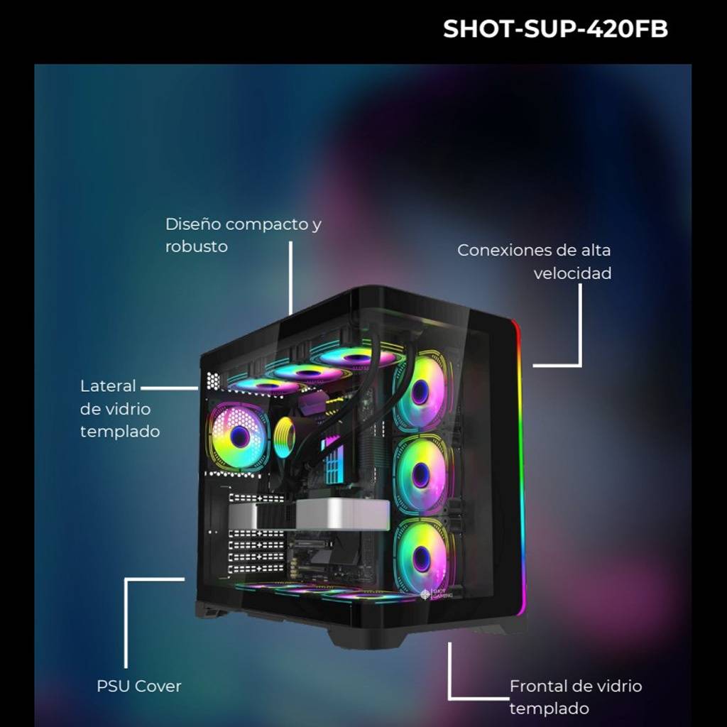El SHOT-SUP-420FB es un gabinete gamer tipo pecera con RGB integrado, panel frontal y lateral de vidrio templado y diseño compacto pero espacioso. Ofrece excelente flujo de aire, soporte para hasta diez ventiladores y espacio holgado para hardware de alto rendimiento. Su estructura en acero SPCC y el PSU Cover permiten un armado limpio, robusto y estético para setups ATX o Micro-ATX.