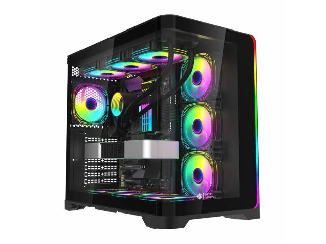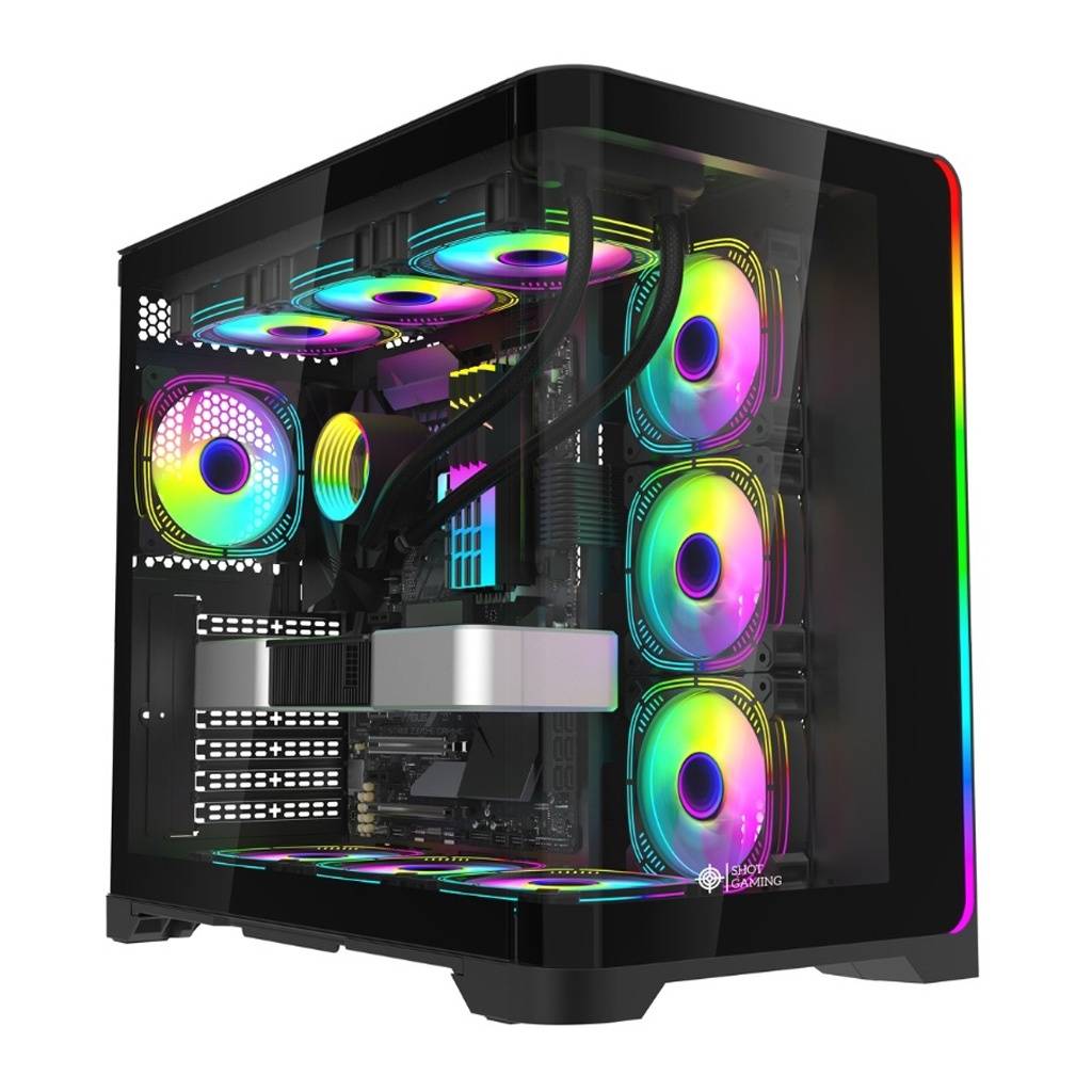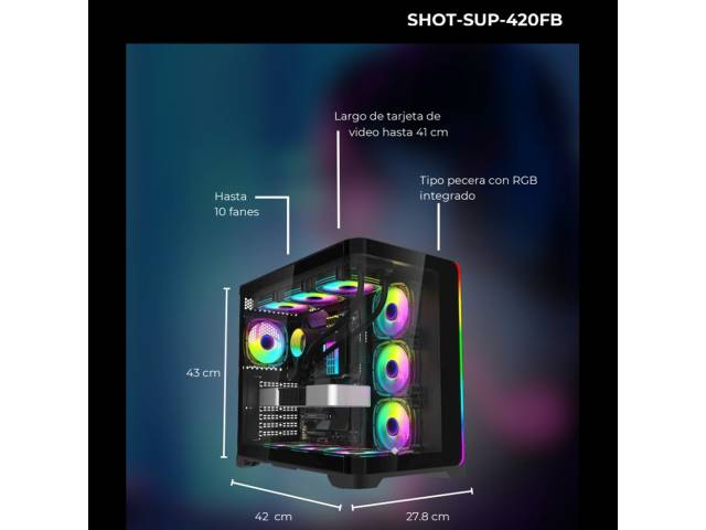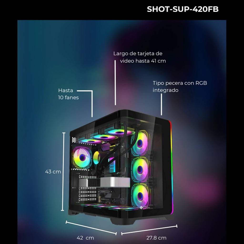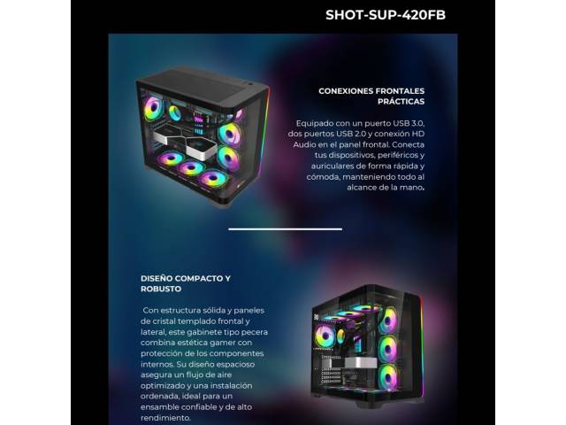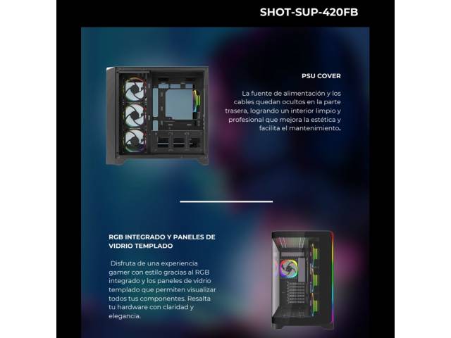El SHOT-SUP-420FB es un gabinete gamer tipo pecera con RGB integrado, panel frontal y lateral de vidrio templado y diseño compacto pero espacioso. Ofrece excelente flujo de aire, soporte para hasta diez ventiladores y espacio holgado para hardware de alto rendimiento. Su estructura en acero SPCC y el PSU Cover permiten un armado limpio, robusto y estético para setups ATX o Micro-ATX.