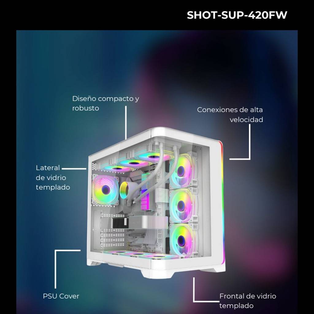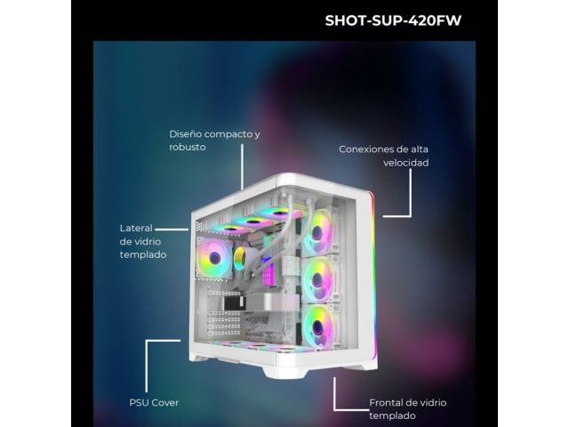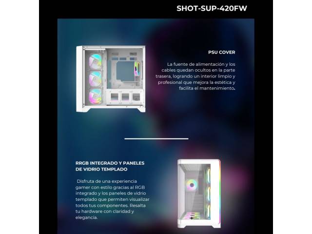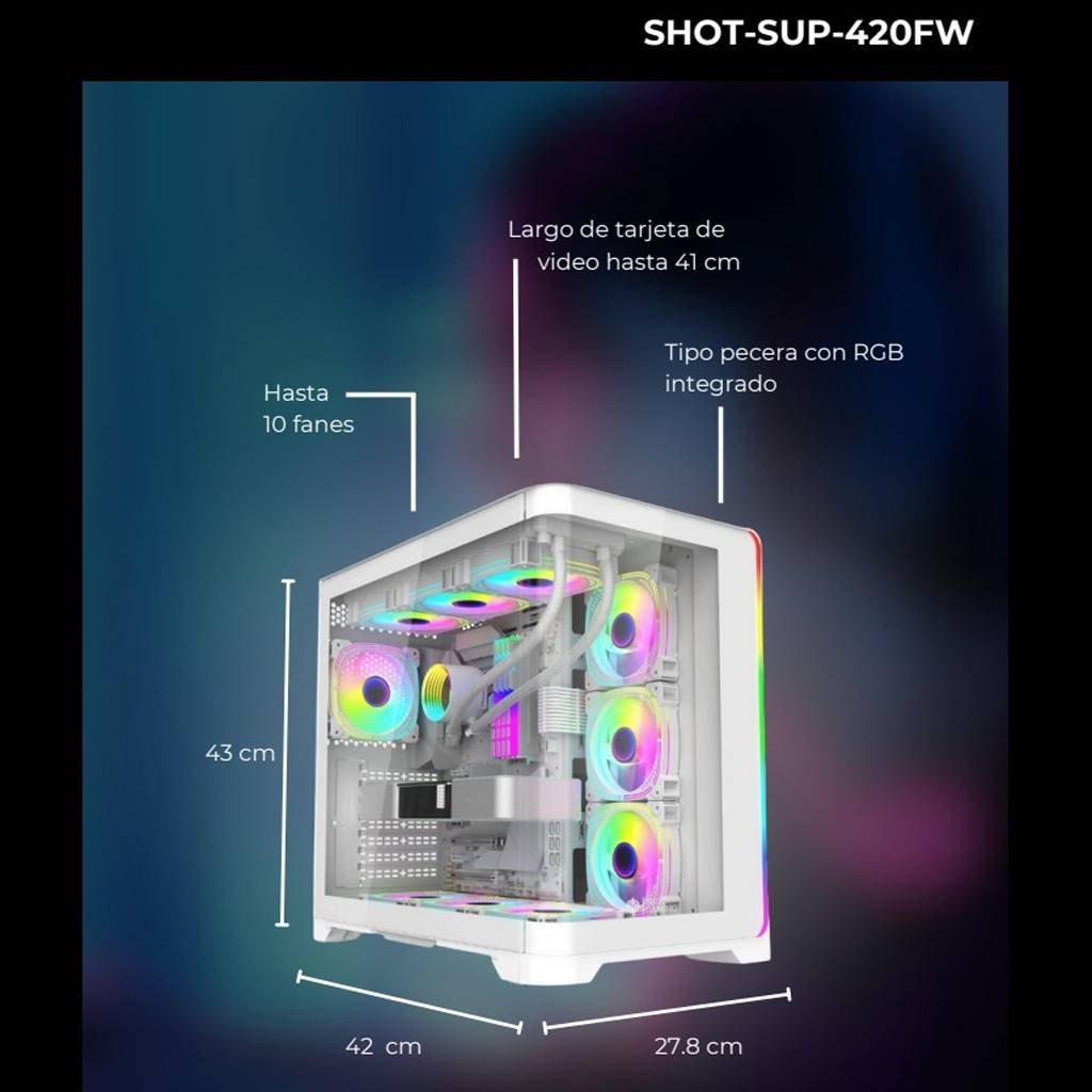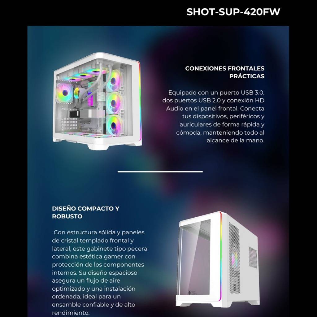 El SHOT-SUP-420FW es un gabinete gamer tipo pecera con RGB integrado, panel frontal y lateral de vidrio templado y diseño compacto pero espacioso. Ofrece excelente flujo de aire, soporte para hasta diez ventiladores y espacio holgado para hardware de alto rendimiento. Su estructura en acero SPCC y el PSU Cover permiten un armado limpio, robusto y estético para setups ATX o Micro-ATX.