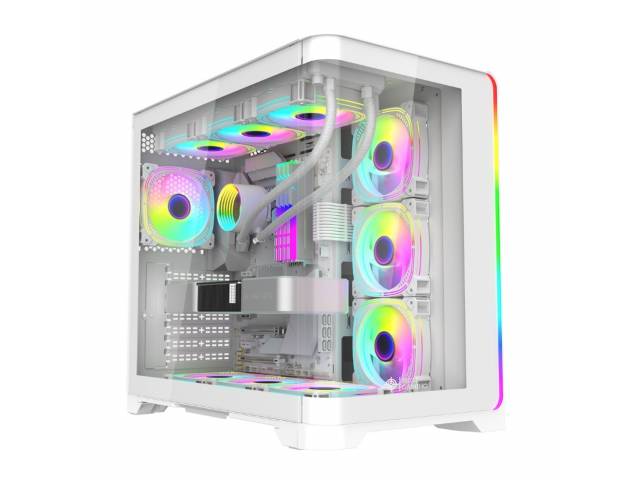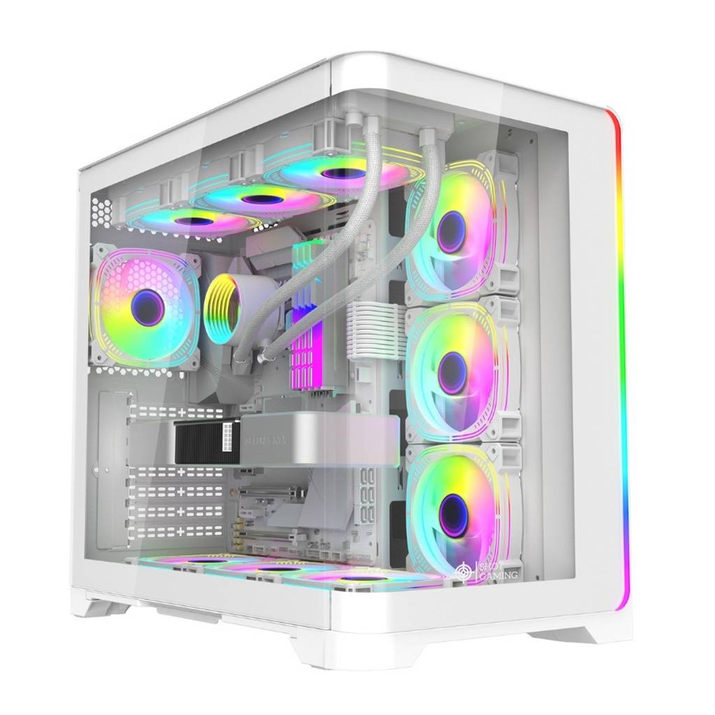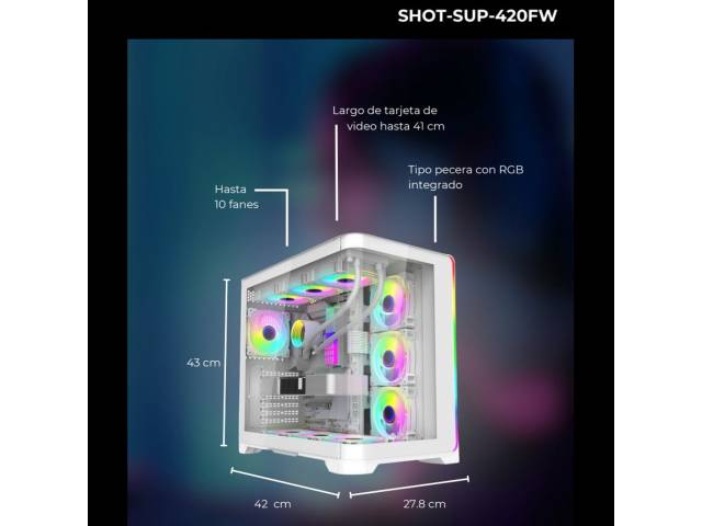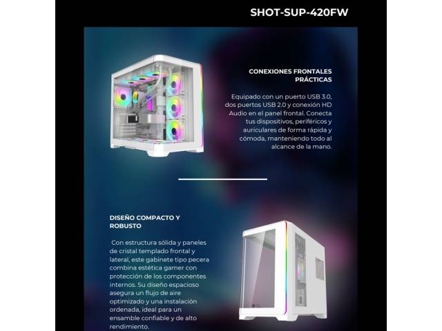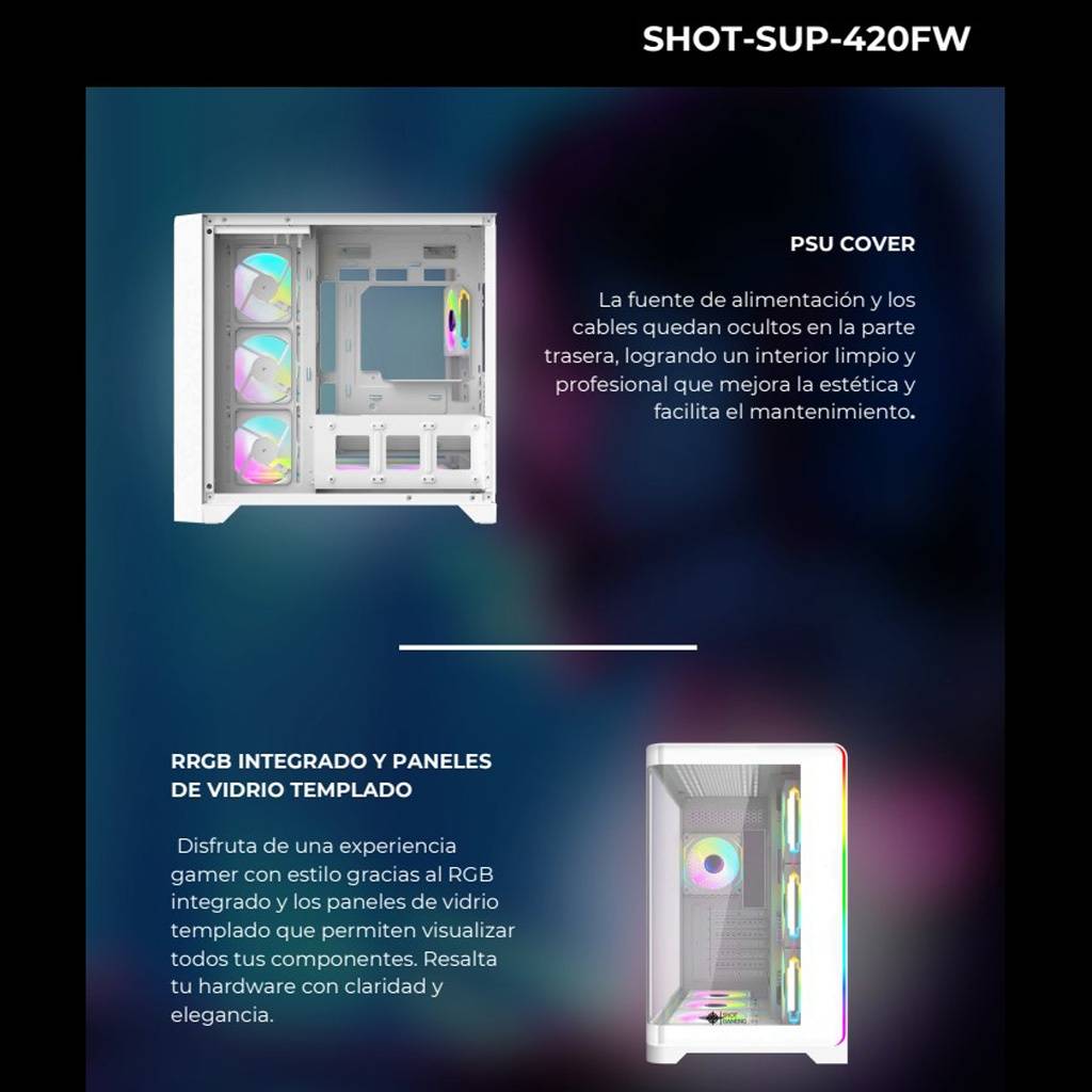 El SHOT-SUP-420FW es un gabinete gamer tipo pecera con RGB integrado, panel frontal y lateral de vidrio templado y diseño compacto pero espacioso. Ofrece excelente flujo de aire, soporte para hasta diez ventiladores y espacio holgado para hardware de alto rendimiento. Su estructura en acero SPCC y el PSU Cover permiten un armado limpio, robusto y estético para setups ATX o Micro-ATX.