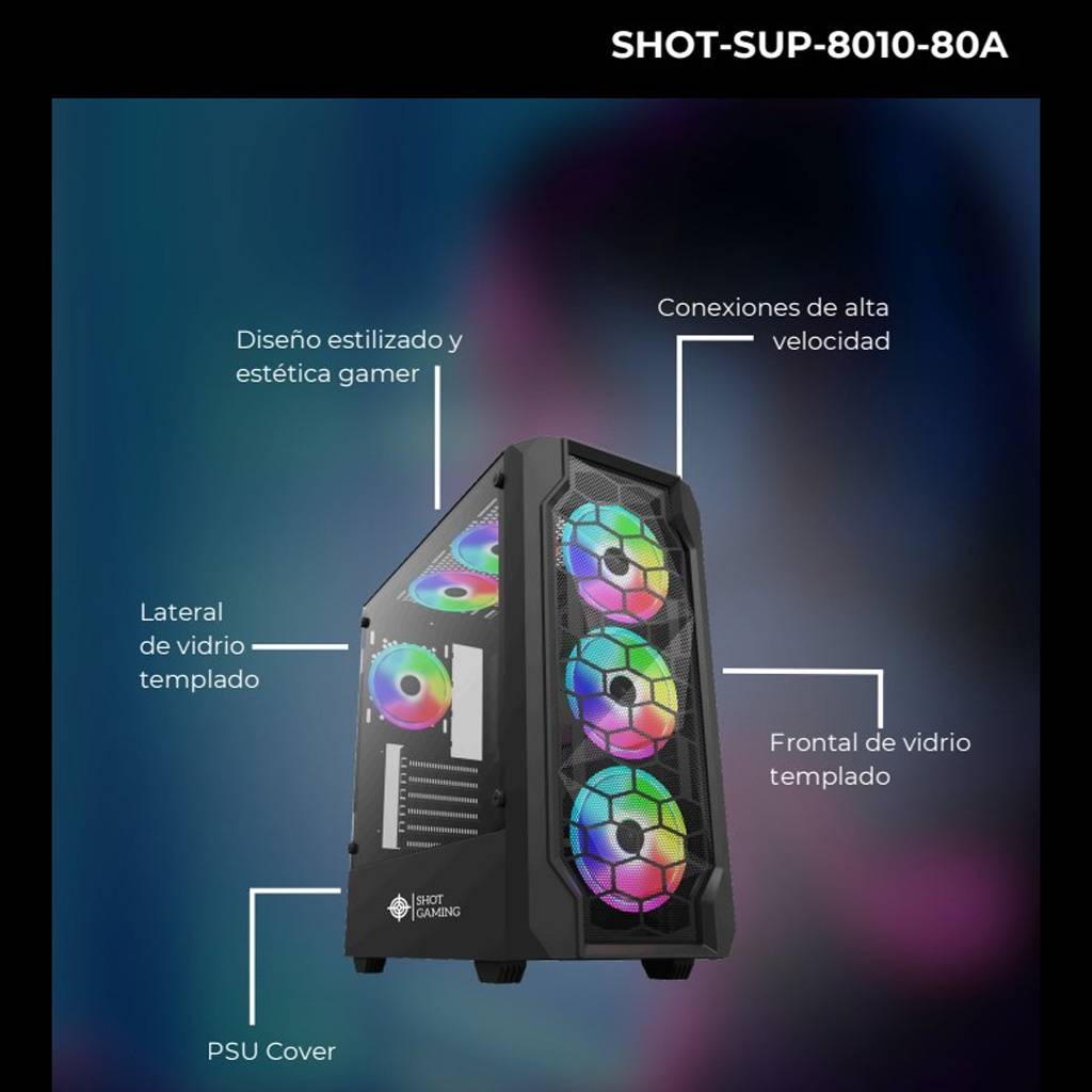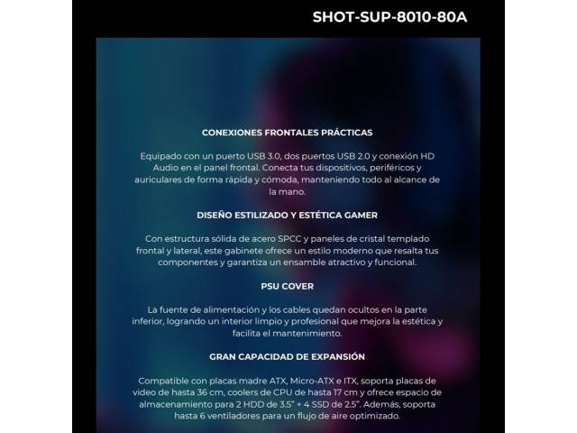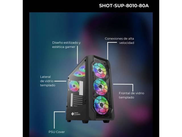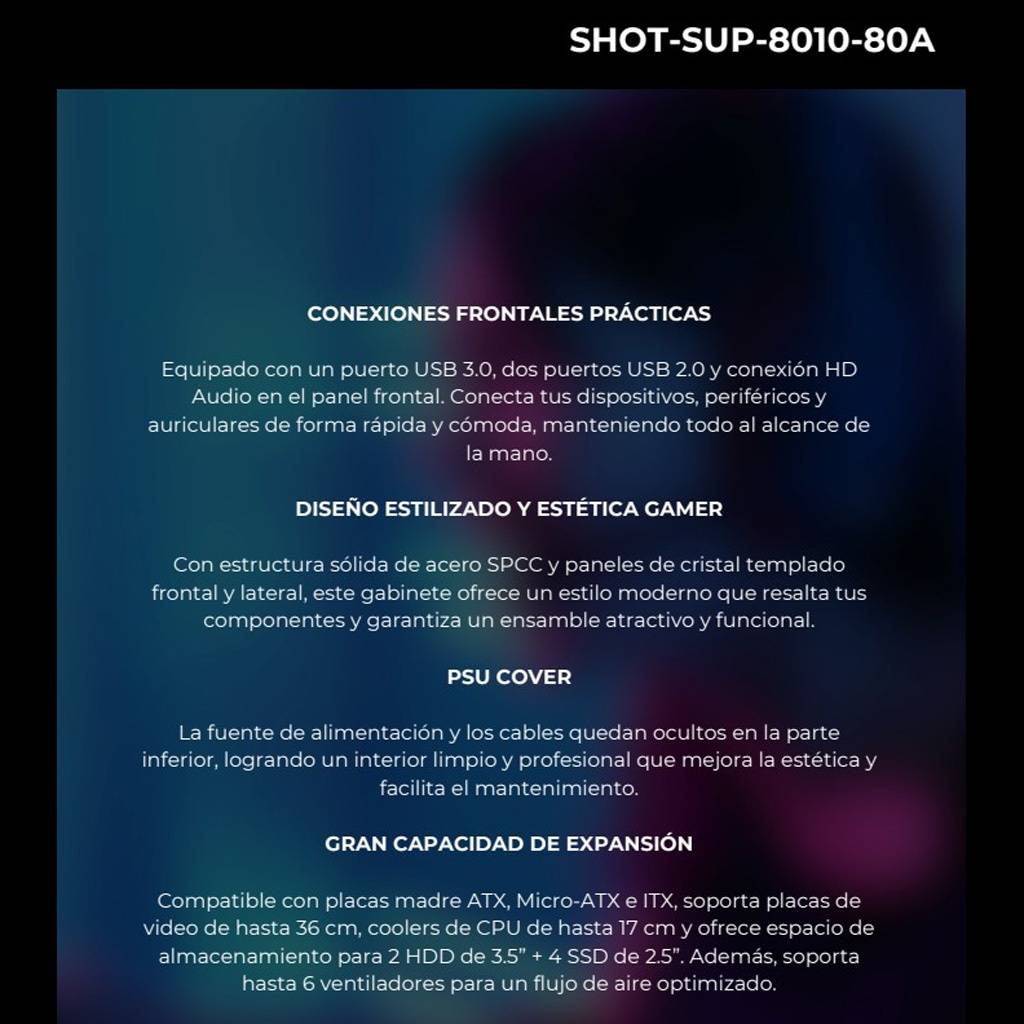 El SHOT-SUP-8010-80A es un gabinete gamer con diseño estilizado y estética moderna, equipado con panel frontal y lateral de vidrio templado que realzan la visibilidad del hardware. Su estructura en acero SPCC ofrece solidez, mientras que el PSU Cover mantiene el interior limpio y ordenado. Es compatible con placas madre ATX, Micro-ATX e ITX, soporta hasta seis ventiladores y permite instalar placas de video de hasta 36 cm, ideal para equipos de alto rendimiento con buena capacidad de expansión.