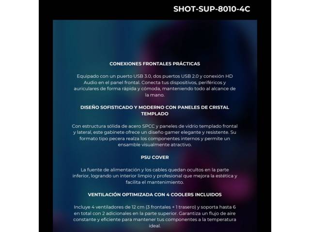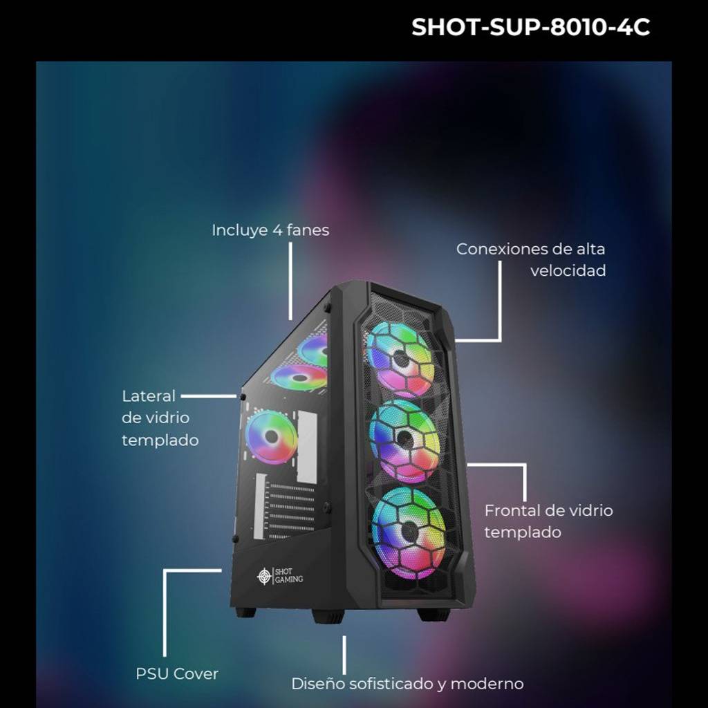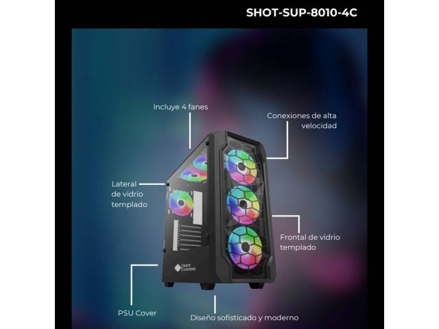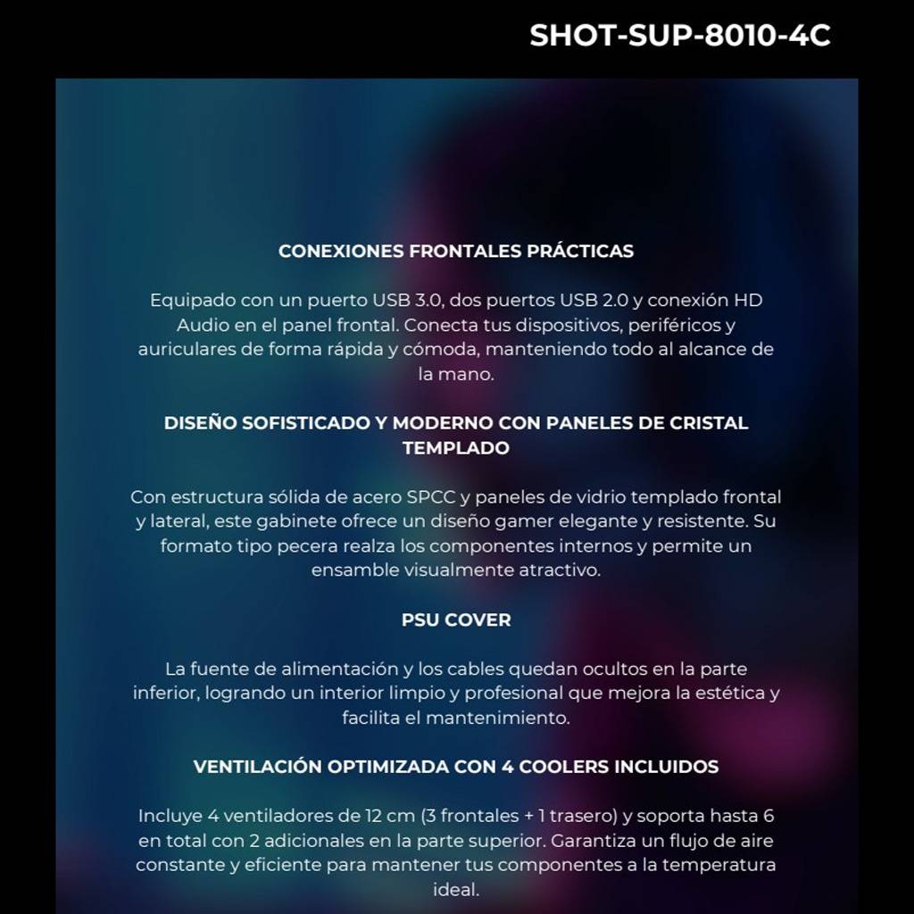 El SHOT-SUP-8010-4C es un gabinete gamer con diseño moderno y paneles frontal y lateral de vidrio templado. Incluye cuatro ventiladores de 12 cm preinstalados y soporta hasta seis en total, garantizando una excelente ventilación interna. Su estructura de acero SPCC, compatibilidad con formatos ATX, Micro-ATX e ITX y su PSU Cover permiten un armado limpio, robusto y visualmente atractivo para equipos compactos y de alto rendimiento.