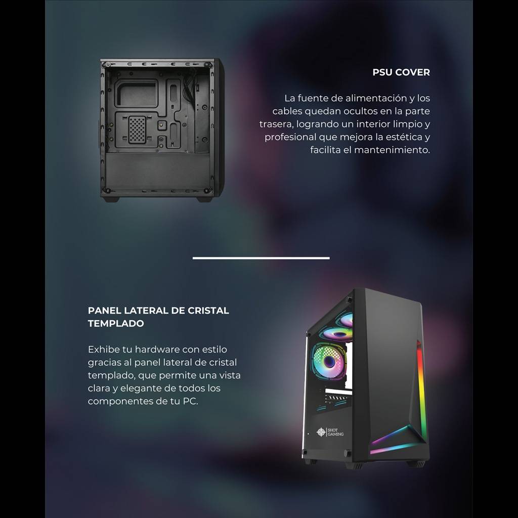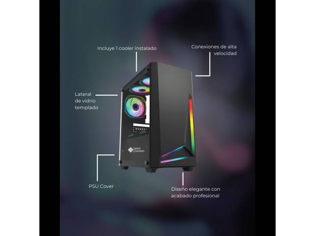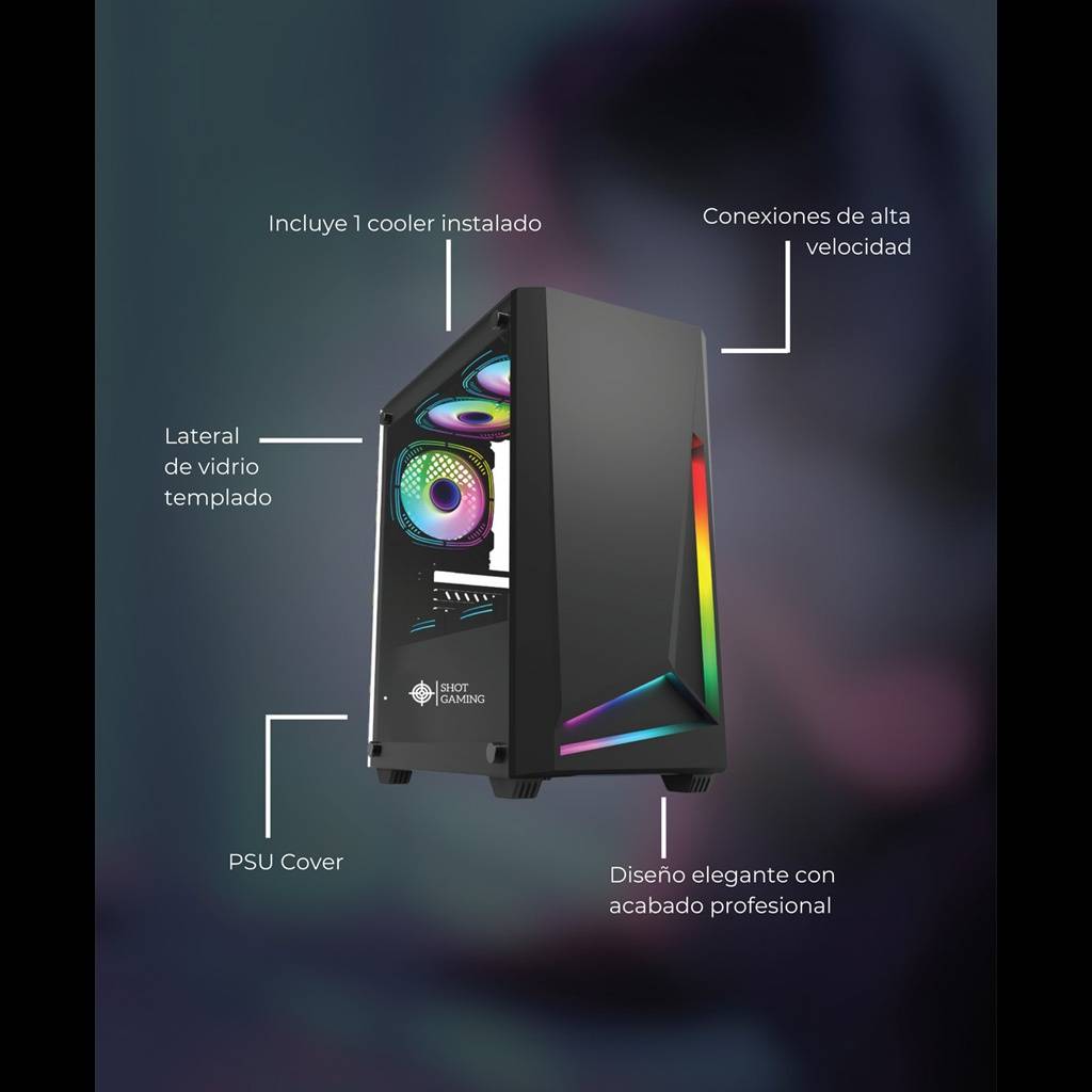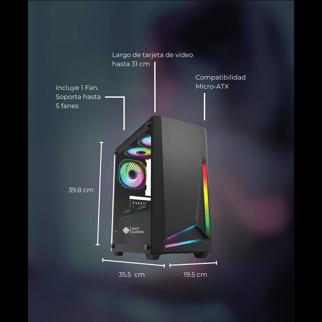 El SHOT-SUP-C1903-1C es un gabinete gamer compacto con diseño elegante y panel lateral de vidrio templado. Incluye un cooler trasero preinstalado y soporta hasta cinco ventiladores en total, ofreciendo buena ventilación para equipos Micro-ATX. Su construcción en acero SPCC de 0.45 mm y el PSU Cover permiten un interior ordenado y profesional, ideal para setups confiables y de perfil compacto.