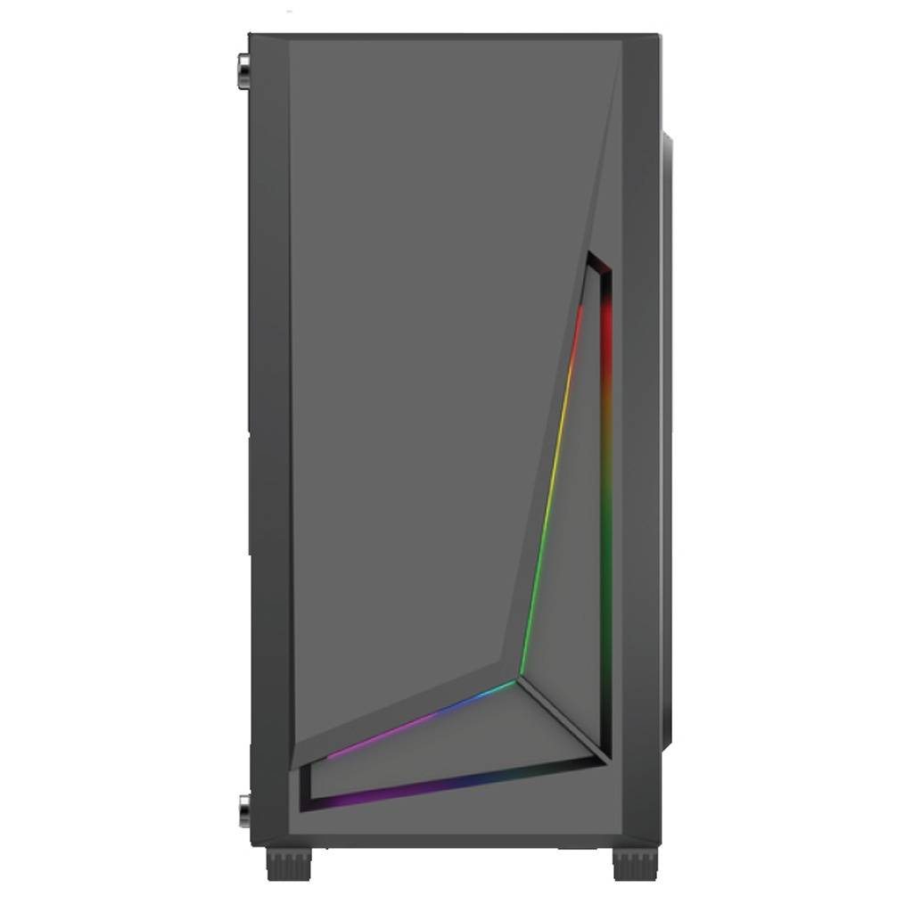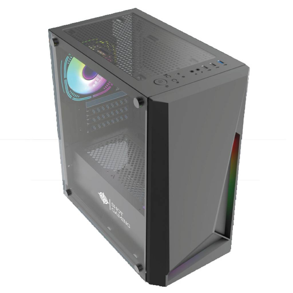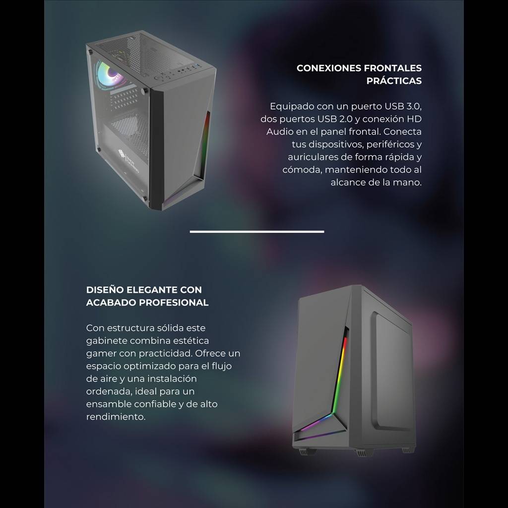 El SHOT-SUP-C1903-1C es un gabinete gamer compacto con diseño elegante y panel lateral de vidrio templado. Incluye un cooler trasero preinstalado y soporta hasta cinco ventiladores en total, ofreciendo buena ventilación para equipos Micro-ATX. Su construcción en acero SPCC de 0.45 mm y el PSU Cover permiten un interior ordenado y profesional, ideal para setups confiables y de perfil compacto.
