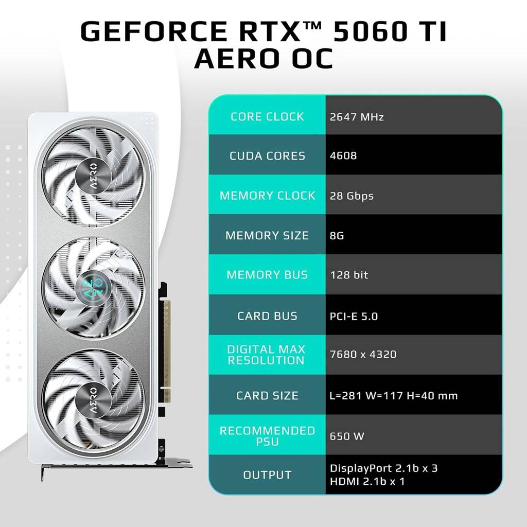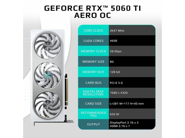 La GeForce RTX 5060 Ti AERO OC 8G es una tarjeta gráfica diseñada para ofrecer un excelente rendimiento en gaming y creación de contenido, combinando eficiencia y potencia en un formato elegante. Con memoria GDDR7 de última generación y frecuencias optimizadas de fábrica, permite disfrutar juegos actuales en alta calidad y aprovechar tecnologías modernas para una experiencia fluida y estable.