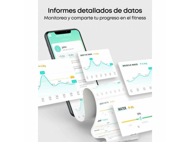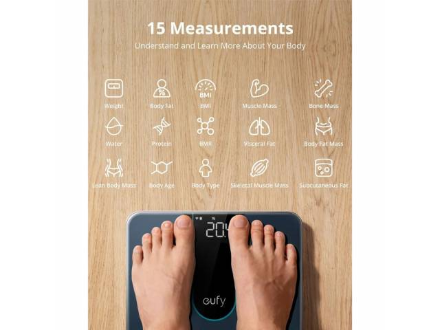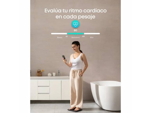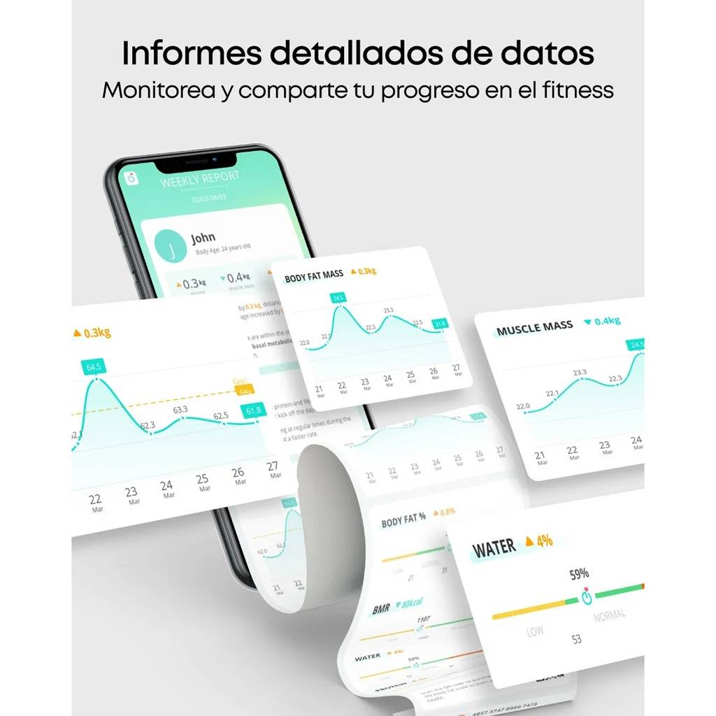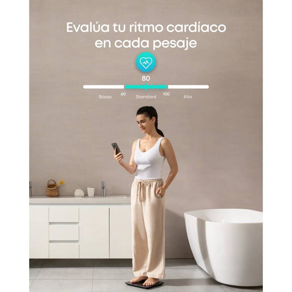 - Mediciones precisas: Obtén 15 lecturas detalladas de tu cuerpo, incluyendo peso, grasa corporal, IMC, masa muscular, masa ósea y más. La superficie ultrasensible de la báscula inteligente detecta cambios sutiles en tu peso corporal con una precisión de hasta 50 g (0,1 lb).